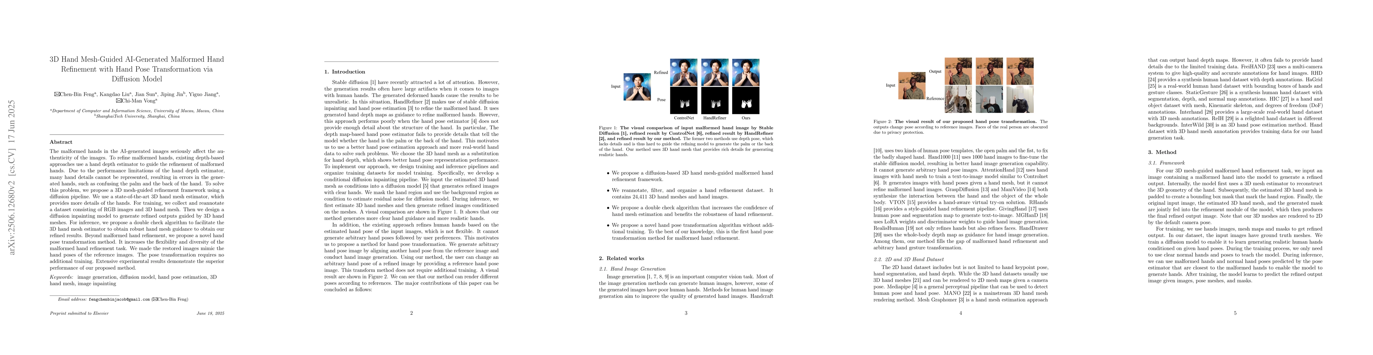 The malformed hands in the AI-generated images seriously affect the authenticity of the images. To refine malformed hands, existing depth-based approaches use a hand depth estimator to guide the refinement of malformed hands. Due to the performance limitations of the hand depth estimator, many hand details cannot be represented, resulting in errors in the generated hands, such as confusing the palm and the back of the hand. To solve this problem, we propose a 3D mesh-guided refinement framework using a diffusion pipeline. We use a state-of-the-art 3D hand mesh estimator, which provides more details of the hands. For training, we collect and reannotate a dataset consisting of RGB images and 3D hand mesh. Then we design a diffusion inpainting model to generate refined outputs guided by 3D hand meshes. For inference, we propose a double check algorithm to facilitate the 3D hand mesh estimator to obtain robust hand mesh guidance to obtain our refined results. Beyond malformed hand refinement, we propose a novel hand pose transformation method. It increases the flexibility and diversity of the malformed hand refinement task. We made the restored images mimic the hand poses of the reference images. The pose transformation requires no additional training. Extensive experimental results demonstrate the superior performance of our proposed method.