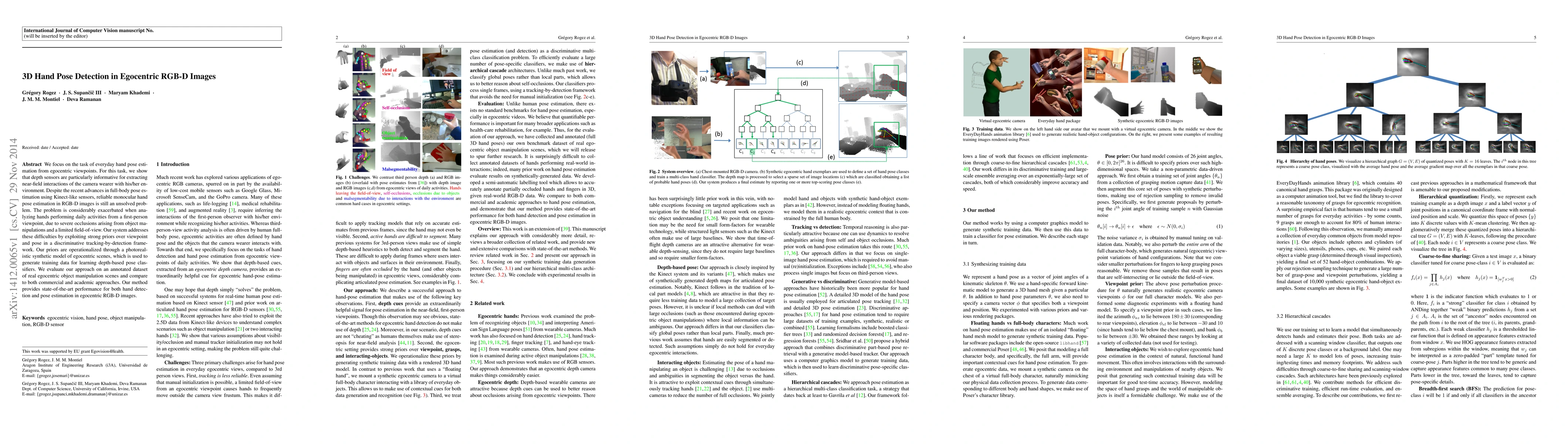 This paper presents a novel method for 3D hand pose detection in egocentric RGB-D images, leveraging depth sensors to overcome occlusions and limited field-of-view challenges. The approach uses synthetic data to generate training for depth-based classifiers, achieving state-of-the-art performance in hand detection and pose estimation.