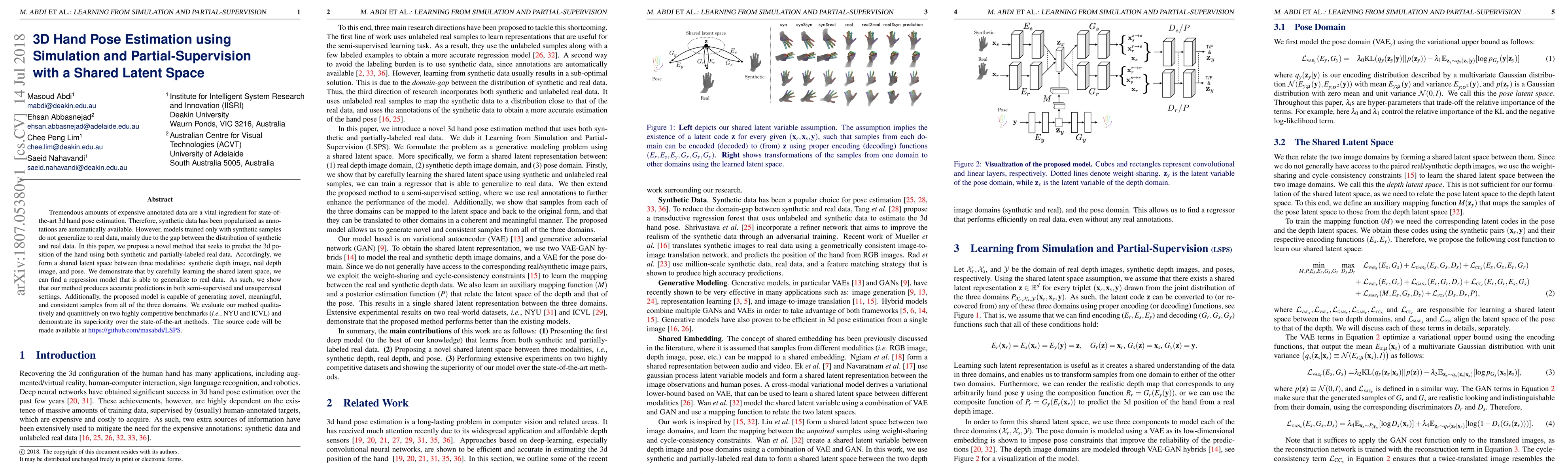 Tremendous amounts of expensive annotated data are a vital ingredient for state-of-the-art 3d hand pose estimation. Therefore, synthetic data has been popularized as annotations are automatically available. However, models trained only with synthetic samples do not generalize to real data, mainly due to the gap between the distribution of synthetic and real data. In this paper, we propose a novel method that seeks to predict the 3d position of the hand using both synthetic and partially-labeled real data. Accordingly, we form a shared latent space between three modalities: synthetic depth image, real depth image, and pose. We demonstrate that by carefully learning the shared latent space, we can find a regression model that is able to generalize to real data. As such, we show that our method produces accurate predictions in both semi-supervised and unsupervised settings. Additionally, the proposed model is capable of generating novel, meaningful, and consistent samples from all of the three domains. We evaluate our method qualitatively and quantitively on two highly competitive benchmarks (i.e., NYU and ICVL) and demonstrate its superiority over the state-of-the-art methods. The source code will be made available at https://github.com/masabdi/LSPS.