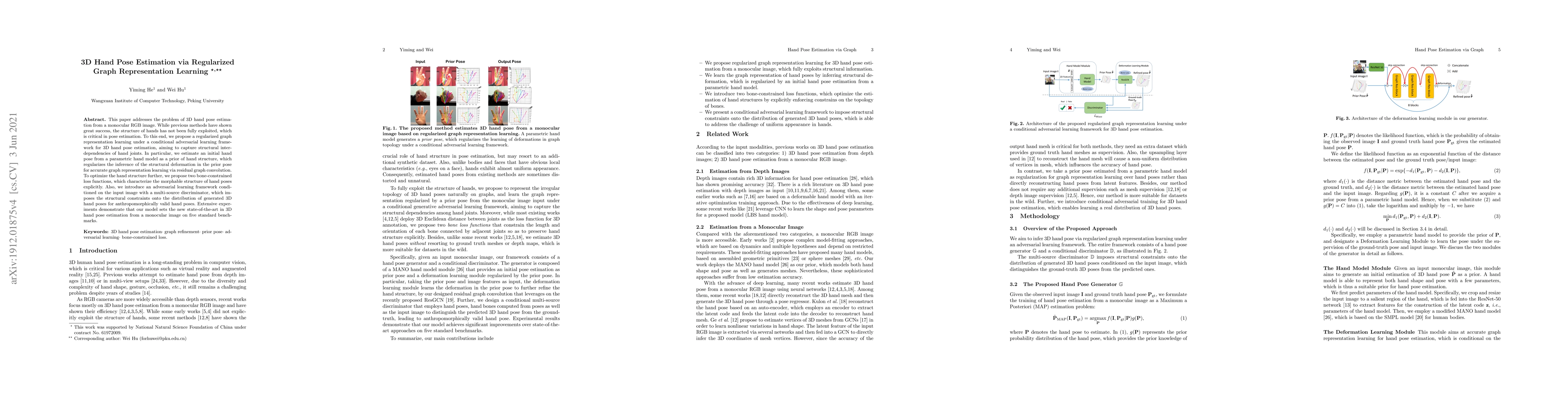 This paper proposes a method for 3D hand pose estimation using regularized graph representation learning within a conditional adversarial framework, leveraging structural inter-dependencies of hand joints and achieving state-of-the-art results on multiple benchmarks. The approach incorporates bone-constrained losses and adversarial learning to ensure anthropomorphically valid poses.