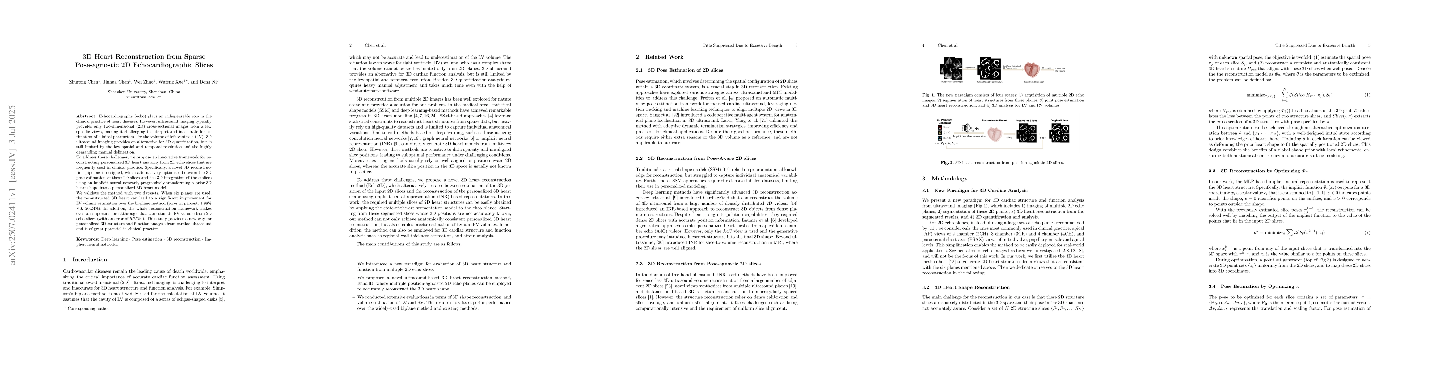 This research introduces a method to reconstruct 3D heart models from 2D echocardiographic slices, frequently used in clinical practice. The novel framework improves left ventricle volume estimation accuracy (error reduced from 20.24% to 1.98%) and enables right ventricle volume estimation for the first time, showing potential for enhanced clinical analysis in heart disease diagnosis.
