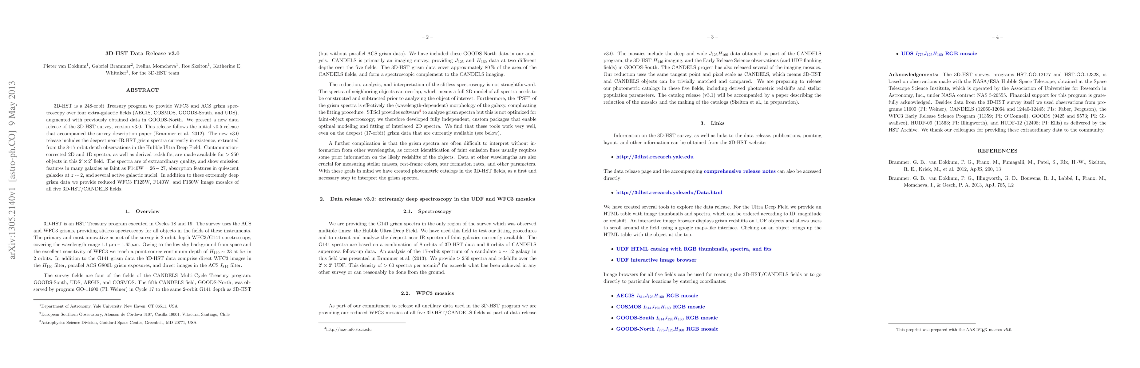 The 3D-HST Data Release v3.0 provides the deepest near-IR grism spectra from the Hubble Ultra Deep Field, revealing emission and absorption features in faint galaxies and active galactic nuclei. It also includes high-quality WFC3 image mosaics across five extra-galactic fields.