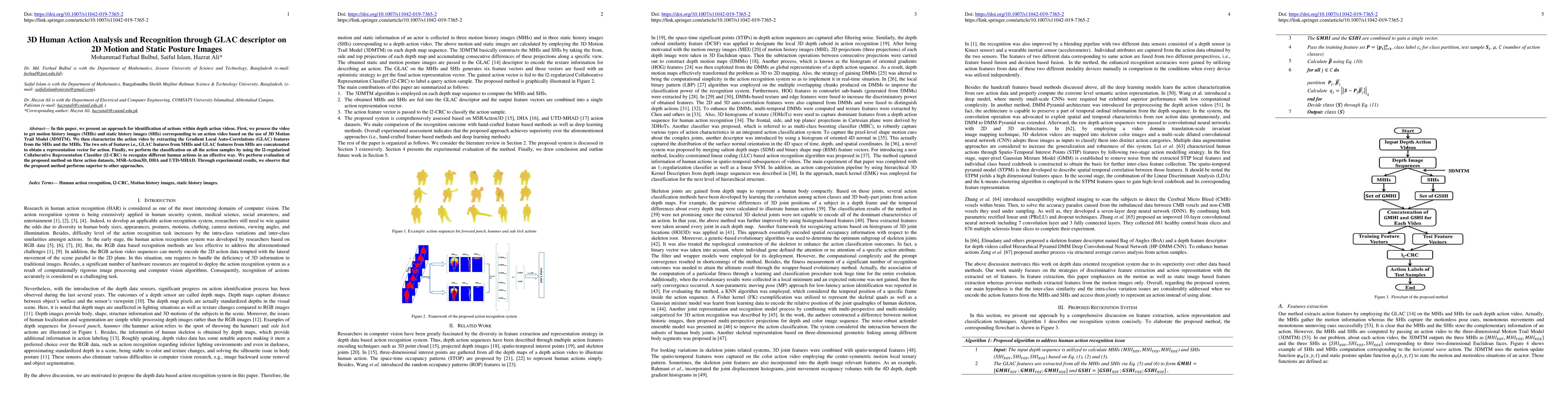This paper proposes a method for 3D human action analysis using GLAC descriptors on 2D motion and static posture images, combining motion history and static history images to extract robust features, and employing an l2-regularized Collaborative Representation Classifier for effective action recognition. Experimental results show superior performance on MSR-Action3D, DHA, and UTD-MHAD datasets.