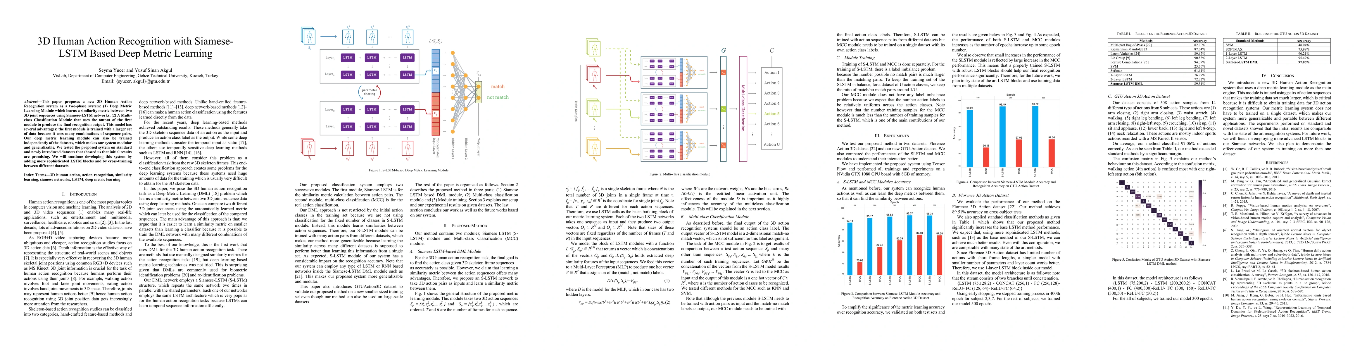 This paper proposes a 3D human action recognition system using Siamese-LSTM based deep metric learning, achieving promising results on both standard and new datasets with the potential for further improvement.