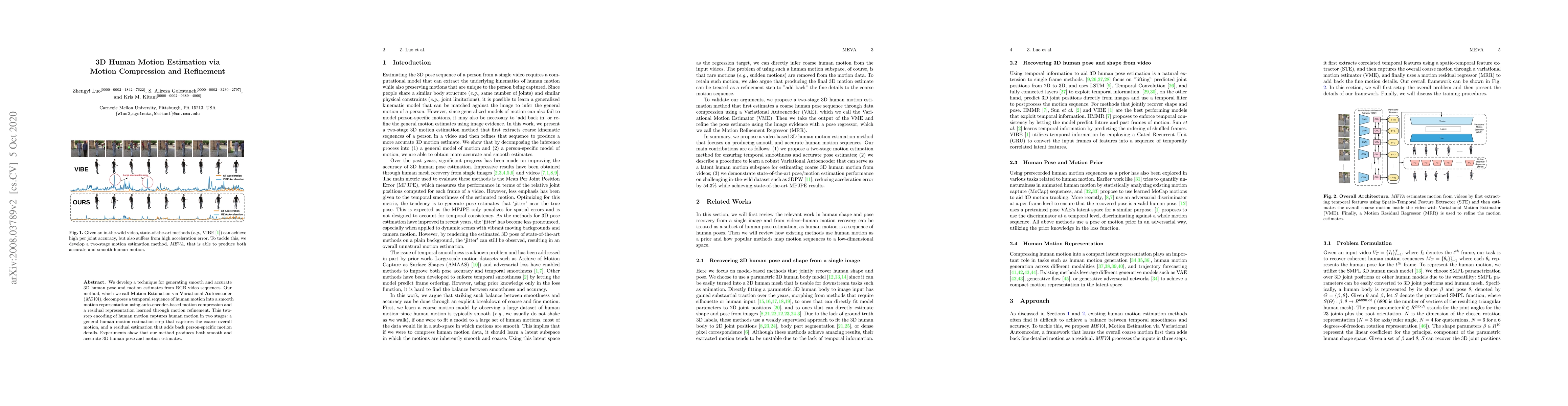 We develop a technique for generating smooth and accurate 3D human pose and motion estimates from RGB video sequences. Our method, which we call Motion Estimation via Variational Autoencoder (MEVA), decomposes a temporal sequence of human motion into a smooth motion representation using auto-encoder-based motion compression and a residual representation learned through motion refinement. This two-step encoding of human motion captures human motion in two stages: a general human motion estimation step that captures the coarse overall motion, and a residual estimation that adds back person-specific motion details. Experiments show that our method produces both smooth and accurate 3D human pose and motion estimates.
