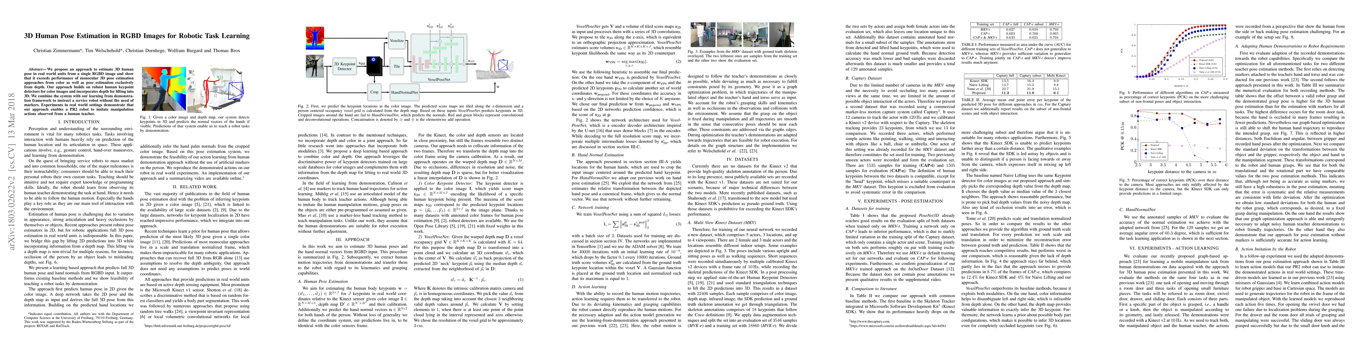 We propose an approach to estimate 3D human pose in real world units from a single RGBD image and show that it exceeds performance of monocular 3D pose estimation approaches from color as well as pose estimation exclusively from depth. Our approach builds on robust human keypoint detectors for color images and incorporates depth for lifting into 3D. We combine the system with our learning from demonstration framework to instruct a service robot without the need of markers. Experiments in real world settings demonstrate that our approach enables a PR2 robot to imitate manipulation actions observed from a human teacher.