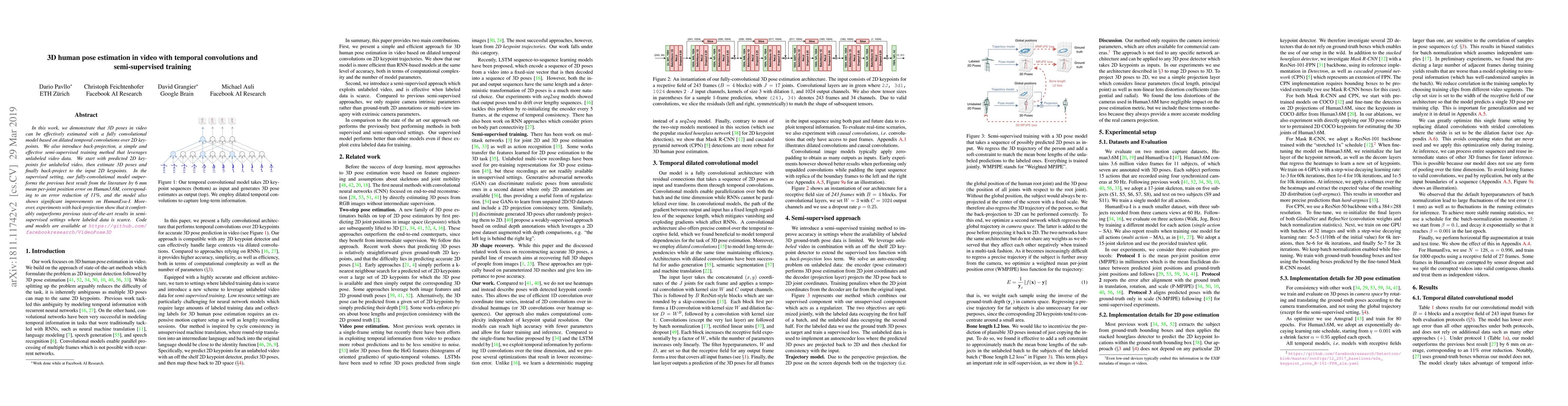 Researchers developed a method for estimating 3D human poses in video using convolutional models with dilated temporal convolutions and semi-supervised training, outperforming previous results and improving performance on limited labeled data.