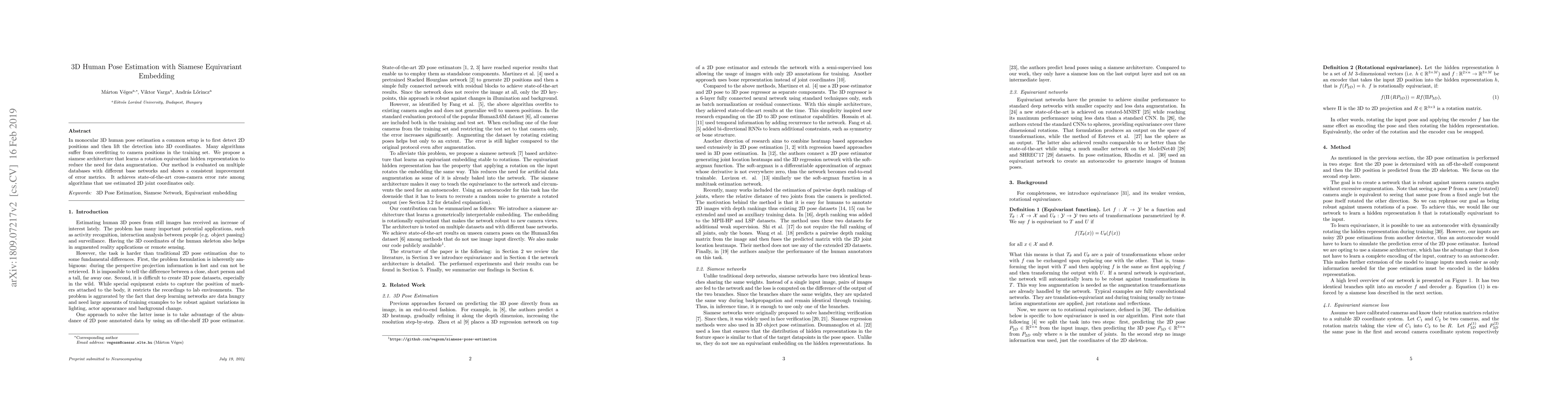 In monocular 3D human pose estimation a common setup is to first detect 2D positions and then lift the detection into 3D coordinates. Many algorithms suffer from overfitting to camera positions in the training set. We propose a siamese architecture that learns a rotation equivariant hidden representation to reduce the need for data augmentation. Our method is evaluated on multiple databases with different base networks and shows a consistent improvement of error metrics. It achieves state-of-the-art cross-camera error rate among algorithms that use estimated 2D joint coordinates only.