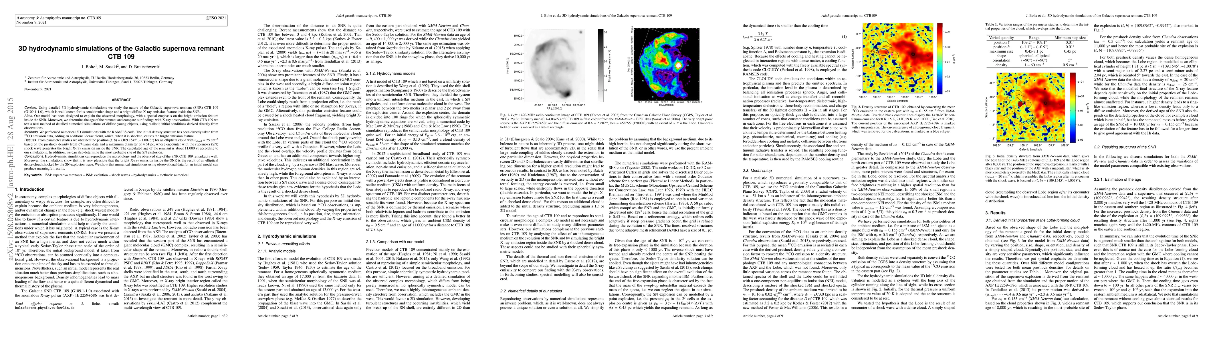 This paper uses 3D hydrodynamic simulations to study the Galactic supernova remnant CTB 109, explaining its semicircular shape and bright X-ray emission feature. The simulations suggest an age of about 11,000 years and identify a dense cloud as the source of the bright emission, validating the use of observational data for initial conditions in numerical simulations.
