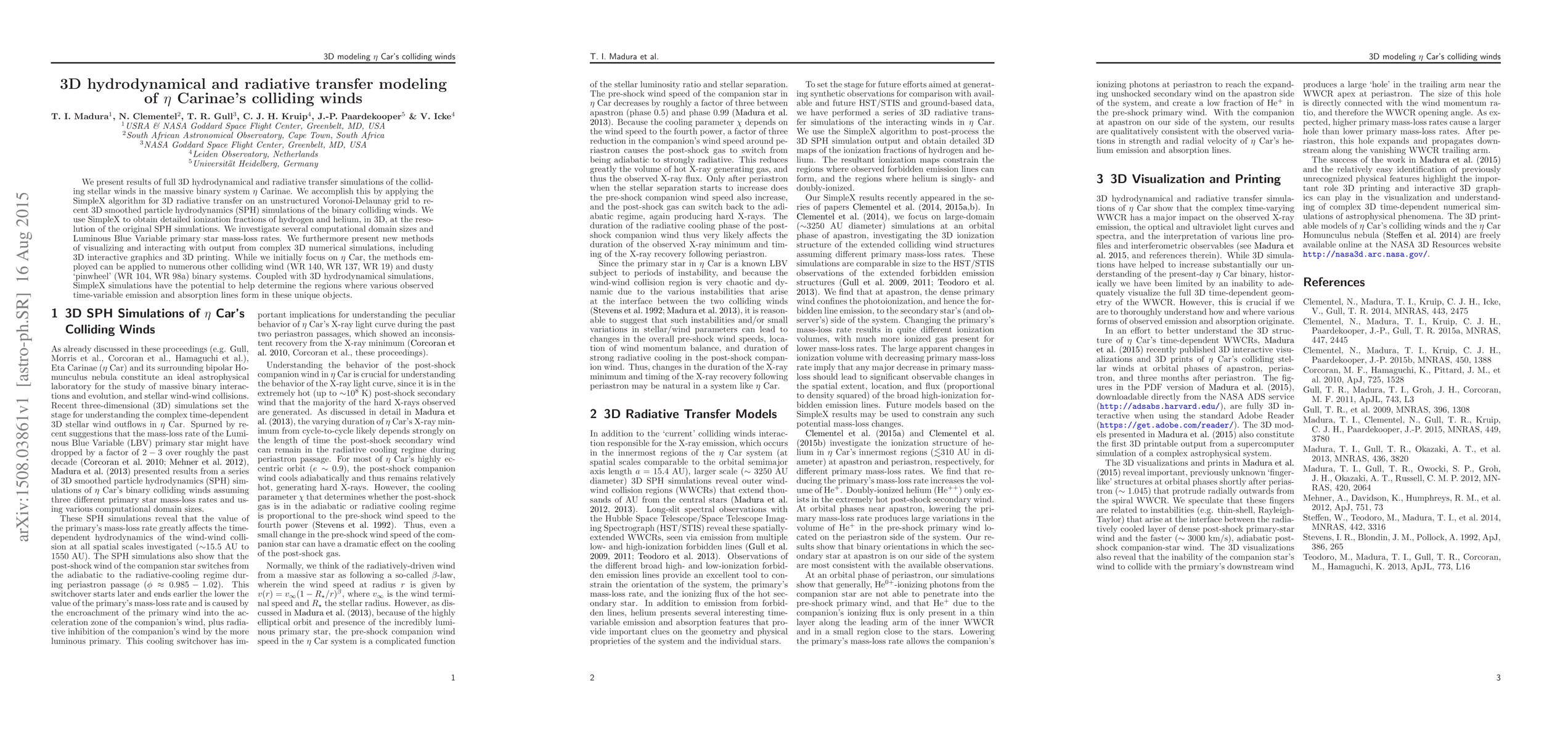 This paper presents 3D hydrodynamical and radiative transfer simulations of the colliding winds in Eta Carinae using the SimpleX algorithm, revealing detailed ionization fractions and new visualization techniques. The methods can be extended to other massive binary systems, aiding in the interpretation of their time-variable emission lines.