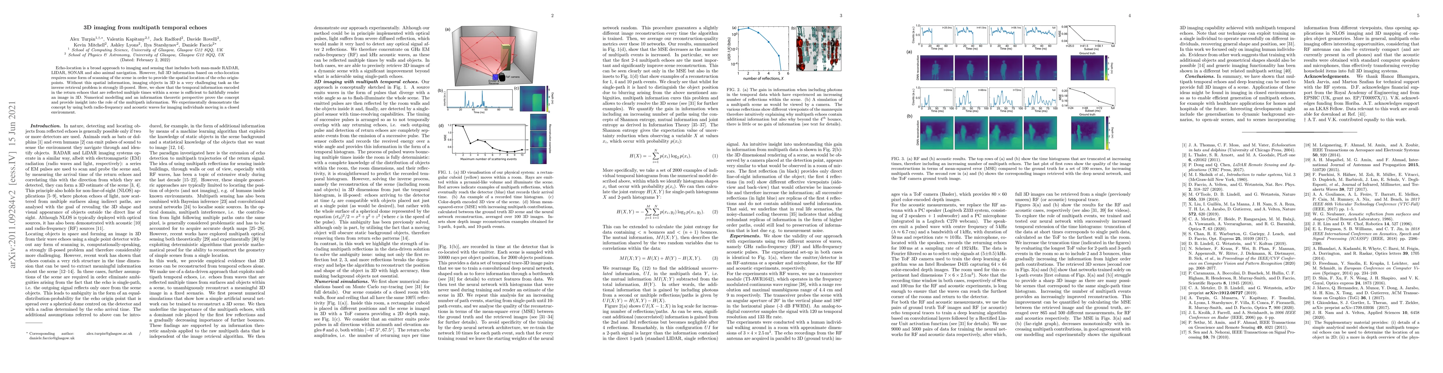 Echo-location is a broad approach to imaging and sensing that includes both man-made RADAR, LIDAR, SONAR and also animal navigation. However, full 3D information based on echo-location requires some form of scanning of the scene in order to provide the spatial location of the echo origin-points. Without this spatial information, imaging objects in 3D is a very challenging task as the inverse retrieval problem is strongly ill-posed. Here, we show that the temporal information encoded in the return echoes that are reflected multiple times within a scene is sufficient to faithfully render an image in 3D. Numerical modelling and an information theoretic perspective prove the concept and provide insight into the role of the multipath information. We experimentally demonstrate the concept by using both radio-frequency and acoustic waves for imaging individuals moving in a closed environment.