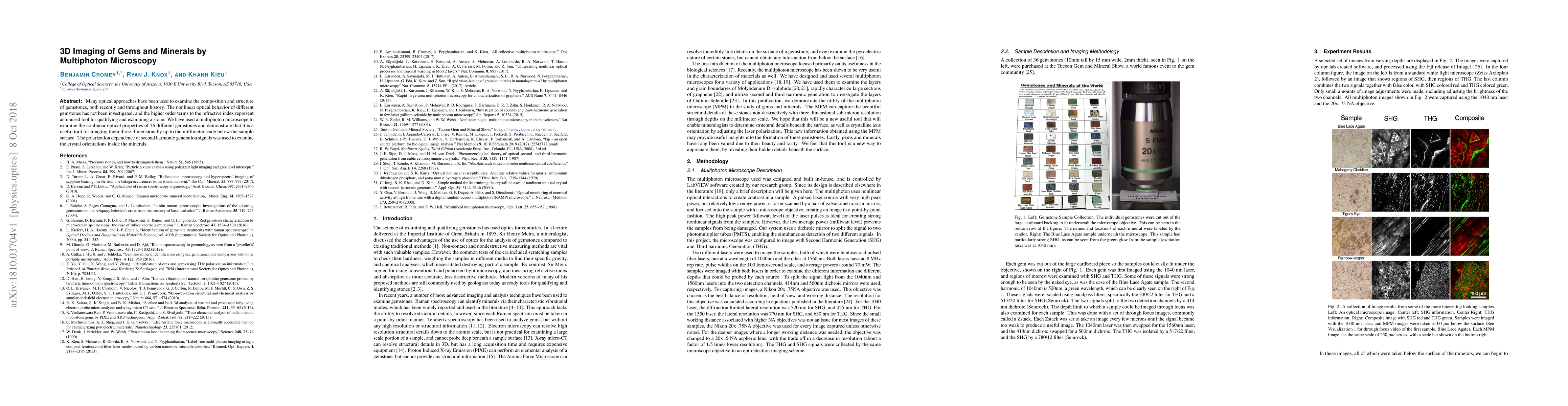 Many optical approaches have been used to examine the composition and structure of gemstones, both recently and throughout history. The nonlinear optical behavior of different gemstones has not been investigated, and the higher order terms to the refractive index represent an unused tool for qualifying and examining a stone. We have used a multiphoton microscope to examine the nonlinear optical properties of 36 different gemstones and demonstrate that it is a useful tool for imaging them three-dimensionally up to the millimeter scale below the sample surface. The polarization dependence of second harmonic generation signals was used to examine the crystal orientations inside the minerals.