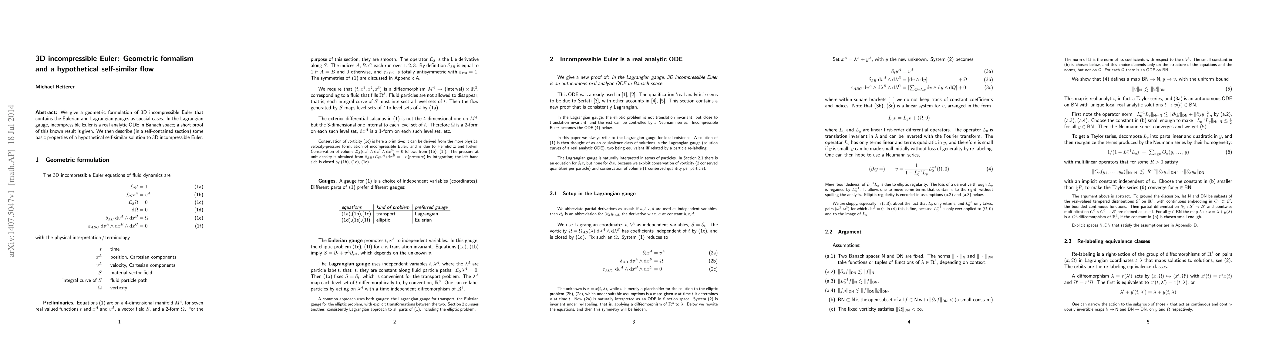 We give a geometric formulation of 3D incompressible Euler that contains the Eulerian and Lagrangian gauges as special cases. In the Lagrangian gauge, incompressible Euler is a real analytic ODE in Banach space; a short proof of this known result is given. We then describe (in a self-contained section) some basic properties of a hypothetical self-similar solution to 3D incompressible Euler.