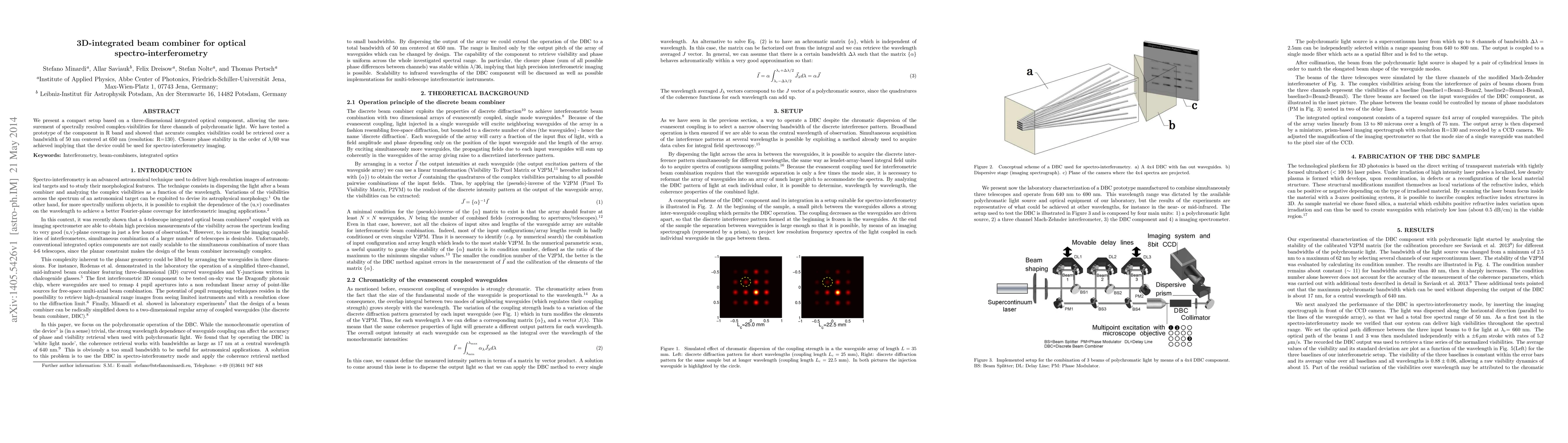 We present a compact setup based on a three-dimensional integrated optical component, allowing the mea- surement of spectrally resolved complex-visibilities for three channels of polychromatic light. We have tested a prototype of the component in R band and showed that accurate complex visibilities could be retrieved over a bandwidth of 50 nm centered at 650 nm (resolution: R=130). Closure phase stability in the order of $\lambda$/60 was achieved implying that the device could be used for spectro-interferometry imaging.
