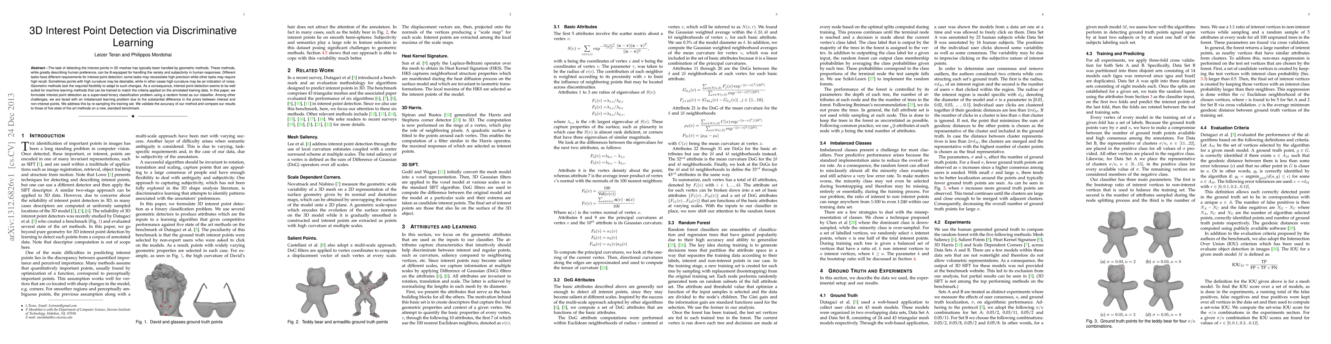 This paper proposes a machine learning approach to detect interest points in 3D meshes using a random forest classifier, addressing the limitations of traditional geometric methods. The method is validated against state-of-the-art techniques on a new benchmark, demonstrating improved adaptability to varying task requirements.