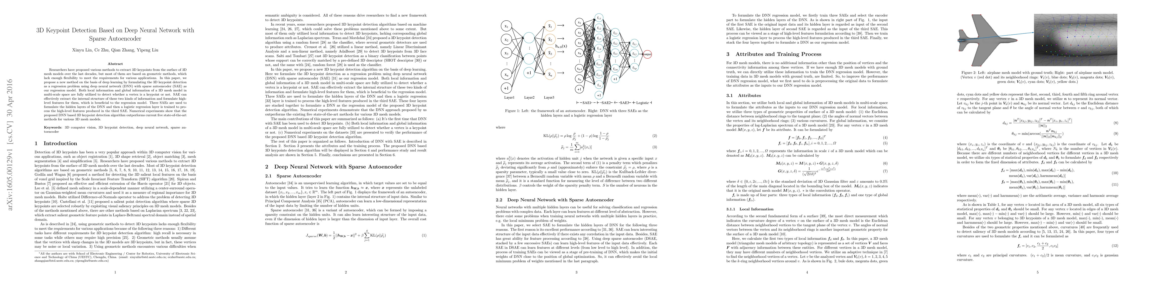 A new method for 3D keypoint detection using a deep neural network with sparse autoencoder outperforms existing methods, effectively utilizing local and global information from 3D mesh models.