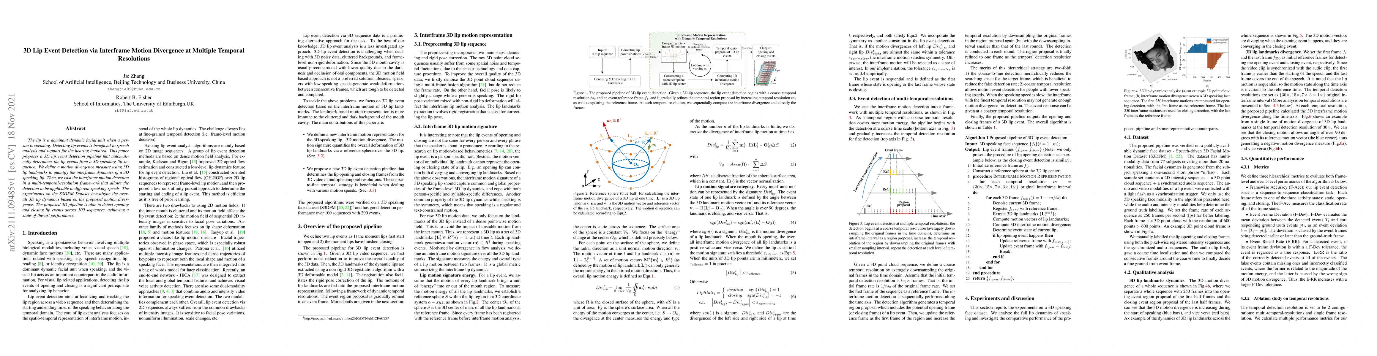 The lip is a dominant dynamic facial unit when a person is speaking. Detecting lip events is beneficial to speech analysis and support for the hearing impaired. This paper proposes a 3D lip event detection pipeline that automatically determines the lip events from a 3D speaking lip sequence. We define a motion divergence measure using 3D lip landmarks to quantify the interframe dynamics of a 3D speaking lip. Then, we cast the interframe motion detection in a multi-temporal-resolution framework that allows the detection to be applicable to different speaking speeds. The experiments on the S3DFM Dataset investigate the overall 3D lip dynamics based on the proposed motion divergence. The proposed 3D pipeline is able to detect opening and closing lip events across 100 sequences, achieving a state-of-the-art performance.