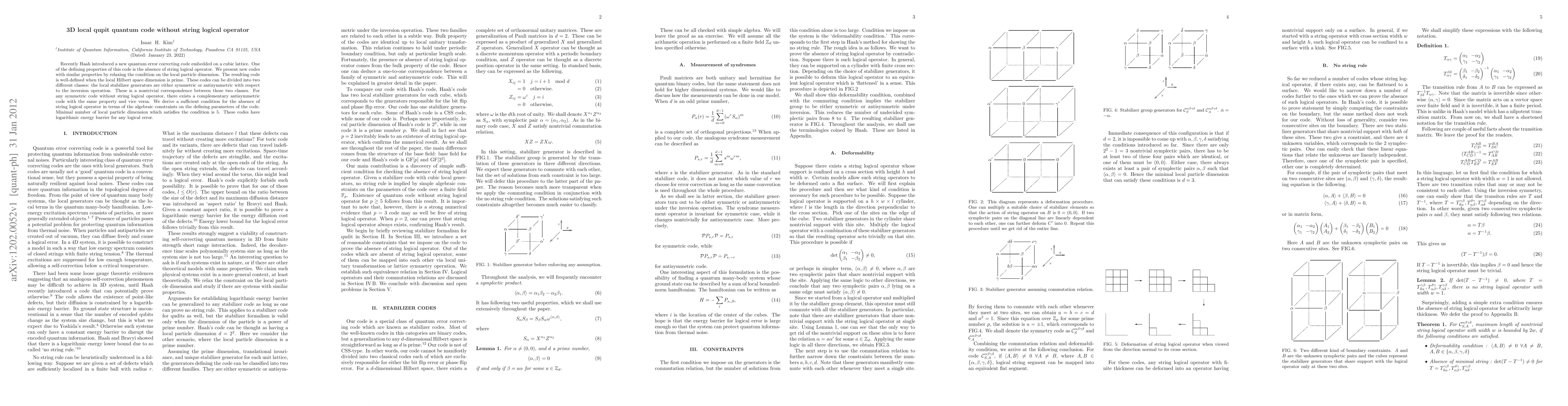 Recently Haah introduced a new quantum error correcting code embedded on a cubic lattice. One of the defining properties of this code is the absence of string logical operator. We present new codes with similar properties by relaxing the condition on the local particle dimension. The resulting code is well-defined when the local Hilbert space dimension is prime. These codes can be divided into two different classes: the local stabilizer generators are either symmetric or antisymmetric with respect to the inversion operation. These is a nontrivial correspondence between these two classes. For any symmetric code without string logical operator, there exists a complementary antisymmetric code with the same property and vice versa. We derive a sufficient condition for the absence of string logical operator in terms of the algebraic constraints on the defining parameters of the code. Minimal number of local particle dimension which satisfies the condition is 5. These codes have logarithmic energy barrier for any logical error.