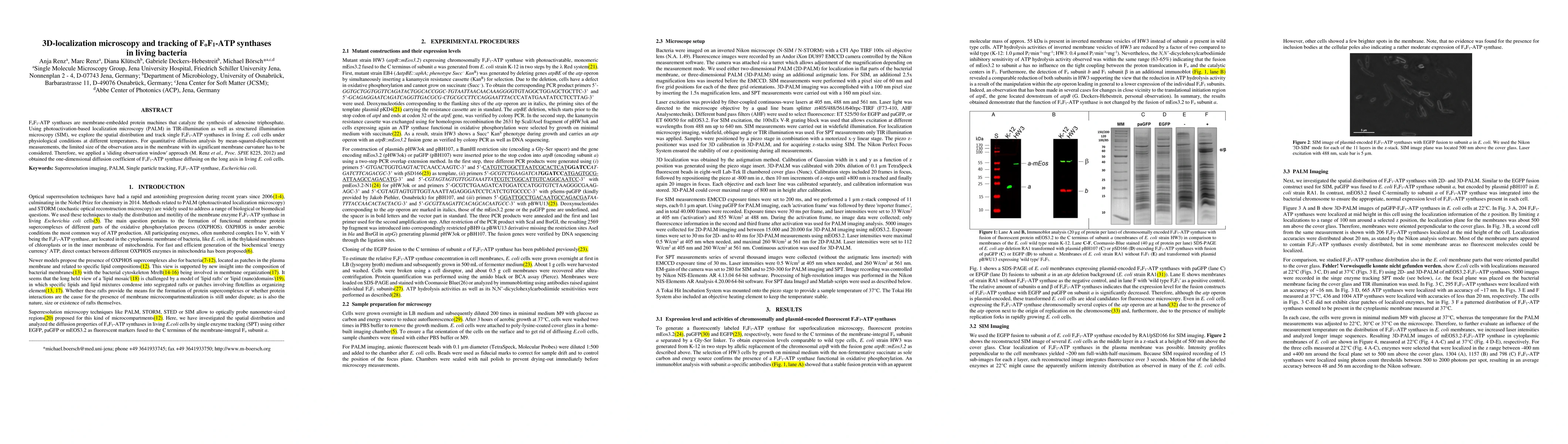 This study employs advanced microscopy techniques to track and spatially analyze FoF1-ATP synthases in living E. coli cells, revealing their diffusion behavior under physiological conditions. The 'sliding observation window' approach was used to account for membrane curvature, yielding a one-dimensional diffusion coefficient for these protein machines.