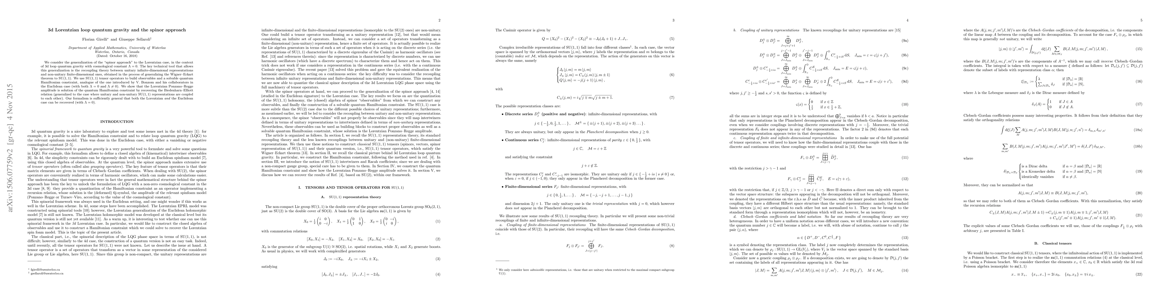 We consider the generalization of the "spinor approach" to the Lorentzian case, in the context of 3d loop quantum gravity with cosmological constant $\Lambda=0$. The key technical tool that allows this generalization is the recoupling theory between unitary infinite-dimensional representations and non-unitary finite-dimensional ones, obtained in the process of generalizing the Wigner-Eckart theorem to SU(1,1). We use SU(1,1) tensor operators to build observables and a solvable quantum Hamiltonian constraint, analogue of the one introduced by V. Bonzom and his collaborators in the Euclidean case (with both $\Lambda=0$ and $\Lambda\neq0$). We show that the Lorentzian Ponzano-Regge amplitude is solution of the quantum Hamiltonian constraint by recovering the Biedenharn-Elliott relation (generalized to the case where unitary and non-unitary SU(1,1) representations are coupled to each other). Our formalism is sufficiently general that both the Lorentzian and the Euclidean case can be recovered (with $\Lambda=0$).