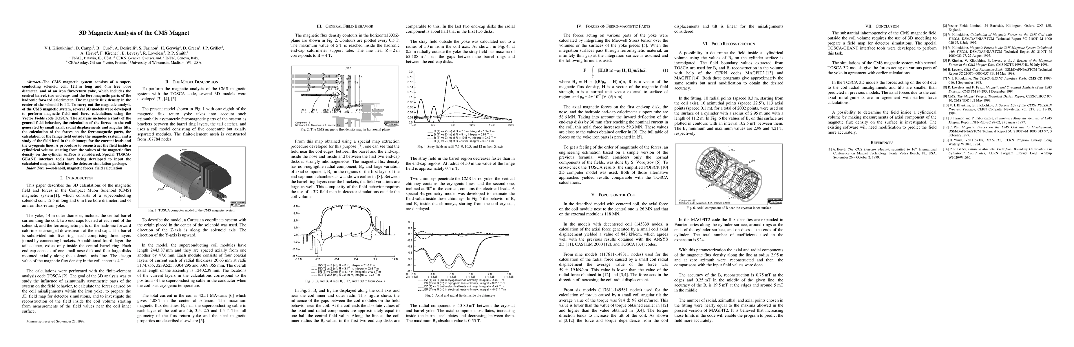 The CMS magnetic system consists of a super-conducting solenoid coil, 12.5 m long and 6 m free bore diameter, and of an iron flux-return yoke, which includes the central barrel, two end-caps and the ferromagnetic parts of the hadronic forward calorimeter. The magnetic flux density in the center of the solenoid is 4 T. To carry out the magnetic analysis of the CMS magnetic system, several 3D models were developed to perform magnetic field and force calculations using the Vector Fields code TOSCA. The analysis includes a study of the general field behavior, the calculation of the forces on the coil generated by small axial, radial displacements and angular tilts, the calculation of the forces on the ferromagnetic parts, the calculation of the fringe field outside the magnetic system, and a study of the field level in the chimneys for the current leads and the cryogenic lines. A procedure to reconstruct the field inside a cylindrical volume starting from the values of the magnetic flux density on the cylinder surface is considered. Special TOSCA-GEANT interface tools have being developed to input the calculated magnetic field into the detector simulation package.