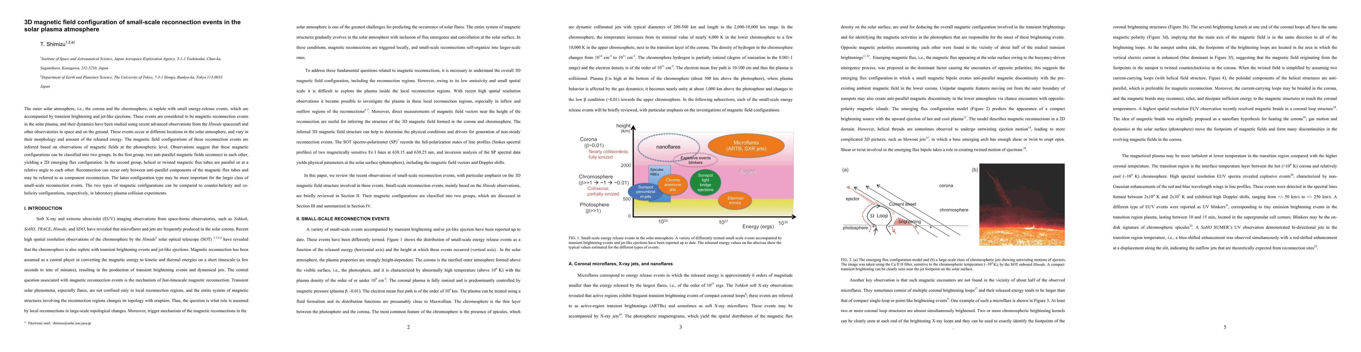 The outer solar atmosphere, i.e., the corona and the chromosphere, is replete with small energy-release events, which are accompanied by transient brightening and jet-like ejections. These events are considered to be magnetic reconnection events in the solar plasma, and their dynamics have been studied using recent advanced observations from the Hinode spacecraft and other observatories in space and on the ground. These events occur at different locations in the solar atmosphere, and vary in their morphology and amount of the released energy. The magnetic field configurations of these reconnection events are inferred based on observations of magnetic fields at the photospheric level. Observations suggest that these magnetic configurations can be classified into two groups. In the first group, two anti-parallel magnetic fields reconnect to each other, yielding a 2D emerging flux configuration. In the second group, helical or twisted magnetic flux tubes are parallel or at a relative angle to each other. Reconnection can occur only between anti-parallel components of the magnetic flux tubes and may be referred to as component reconnection. The latter configuration type may be more important for the larger class of small-scale reconnection events. The two types of magnetic configurations can be compared to counter-helicity and co-helicity configurations, respectively, in laboratory plasma collision experiments.