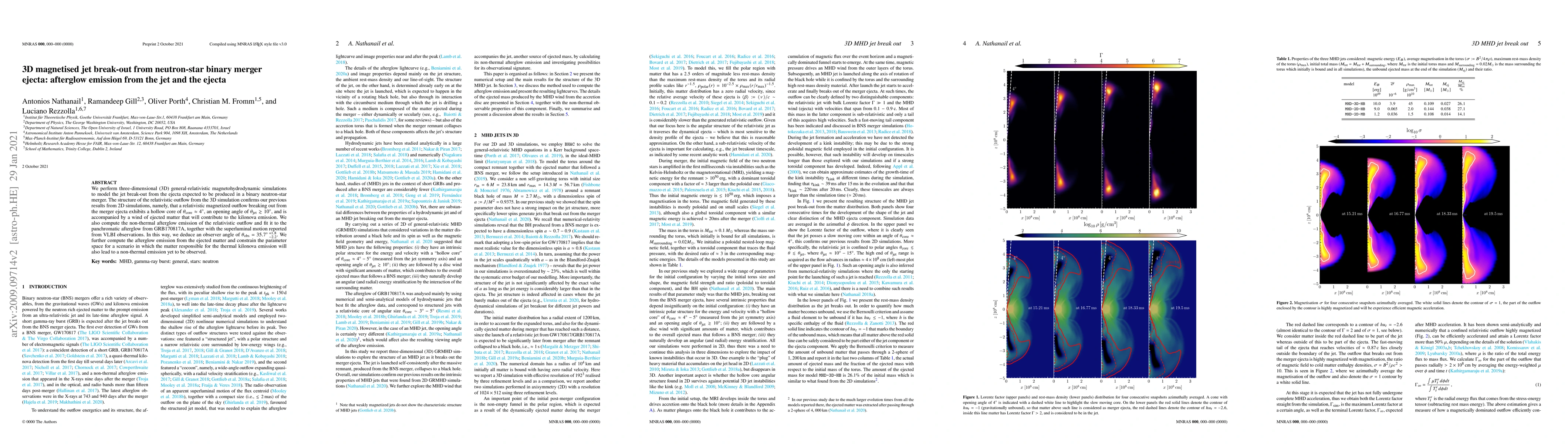 This paper uses 3D simulations to model the jet break-out from neutron-star merger ejecta, confirming a hollow core and wide opening angle. It fits the relativistic outflow's afterglow emission to GRB170817A, deducing an observer angle, and explores the potential for non-thermal emission from ejected matter contributing to kilonovae.