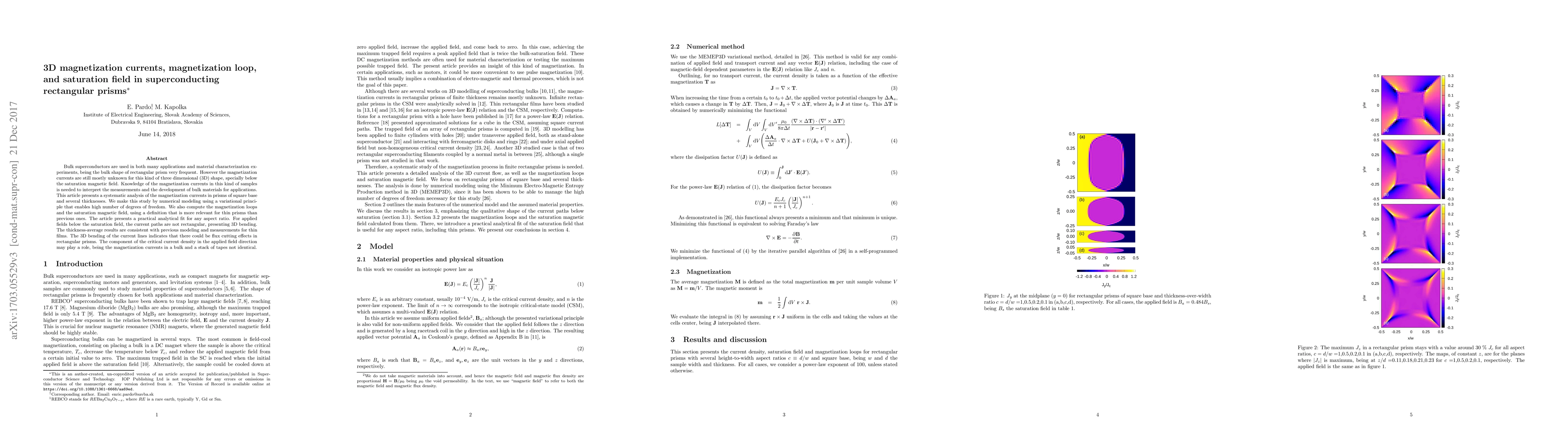 This research paper presents a numerical study on magnetization currents in 3D superconducting rectangular prisms, revealing that current paths bend in three dimensions below saturation magnetic fields. The study uses a variational principle for high-degree modeling and provides a practical analytical fit for various aspect ratios. It also calculates magnetization loops and saturation magnetic fields, suggesting flux cutting effects and differences in magnetization currents between bulk and tape stacks.