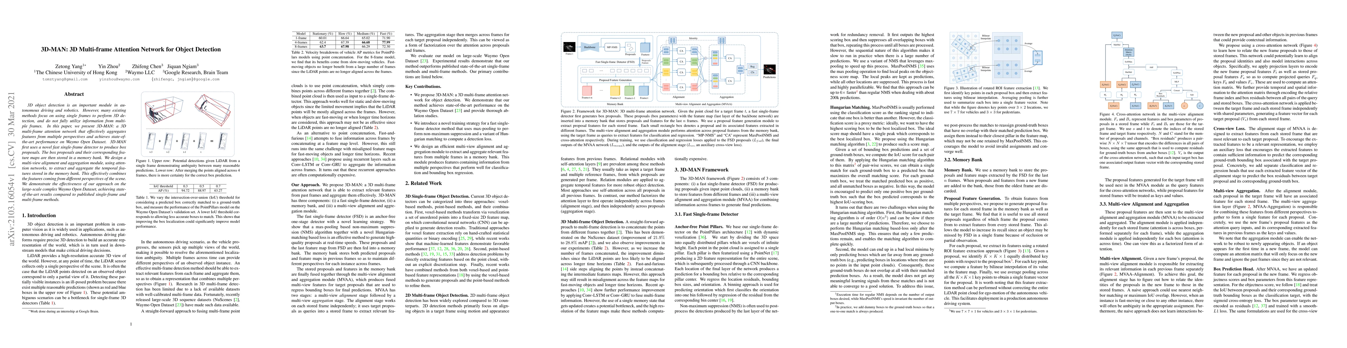 3D object detection is an important module in autonomous driving and robotics. However, many existing methods focus on using single frames to perform 3D detection, and do not fully utilize information from multiple frames. In this paper, we present 3D-MAN: a 3D multi-frame attention network that effectively aggregates features from multiple perspectives and achieves state-of-the-art performance on Waymo Open Dataset. 3D-MAN first uses a novel fast single-frame detector to produce box proposals. The box proposals and their corresponding feature maps are then stored in a memory bank. We design a multi-view alignment and aggregation module, using attention networks, to extract and aggregate the temporal features stored in the memory bank. This effectively combines the features coming from different perspectives of the scene. We demonstrate the effectiveness of our approach on the large-scale complex Waymo Open Dataset, achieving state-of-the-art results compared to published single-frame and multi-frame methods.