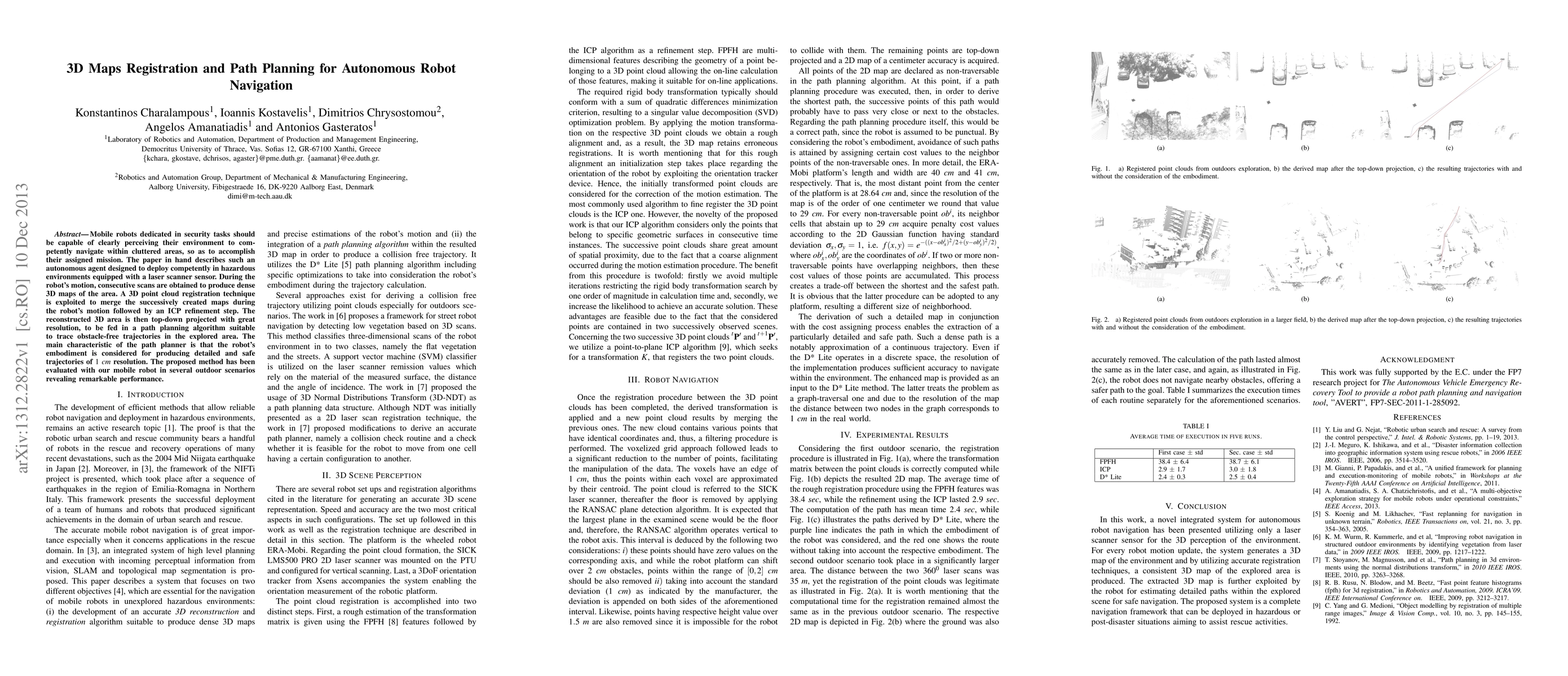 Mobile robots dedicated in security tasks should be capable of clearly perceiving their environment to competently navigate within cluttered areas, so as to accomplish their assigned mission. The paper in hand describes such an autonomous agent designed to deploy competently in hazardous environments equipped with a laser scanner sensor. During the robot's motion, consecutive scans are obtained to produce dense 3D maps of the area. A 3D point cloud registration technique is exploited to merge the successively created maps during the robot's motion followed by an ICP refinement step. The reconstructed 3D area is then top-down projected with great resolution, to be fed in a path planning algorithm suitable to trace obstacle-free trajectories in the explored area. The main characteristic of the path planner is that the robot's embodiment is considered for producing detailed and safe trajectories of $1$ $cm$ resolution. The proposed method has been evaluated with our mobile robot in several outdoor scenarios revealing remarkable performance.