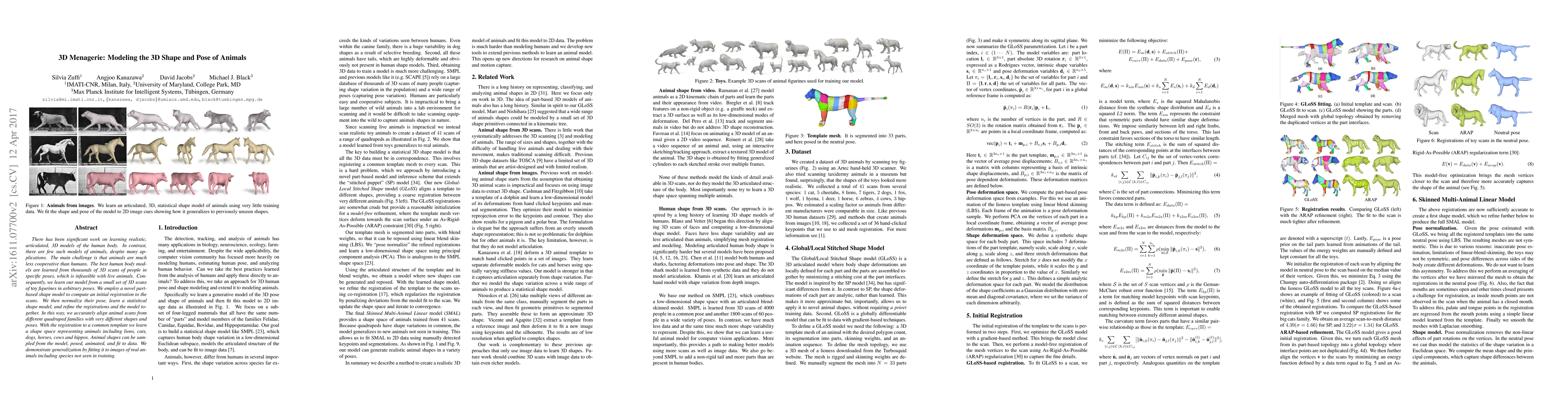 There has been significant work on learning realistic, articulated, 3D models of the human body. In contrast, there are few such models of animals, despite many applications. The main challenge is that animals are much less cooperative than humans. The best human body models are learned from thousands of 3D scans of people in specific poses, which is infeasible with live animals. Consequently, we learn our model from a small set of 3D scans of toy figurines in arbitrary poses. We employ a novel part-based shape model to compute an initial registration to the scans. We then normalize their pose, learn a statistical shape model, and refine the registrations and the model together. In this way, we accurately align animal scans from different quadruped families with very different shapes and poses. With the registration to a common template we learn a shape space representing animals including lions, cats, dogs, horses, cows and hippos. Animal shapes can be sampled from the model, posed, animated, and fit to data. We demonstrate generalization by fitting it to images of real animals including species not seen in training.