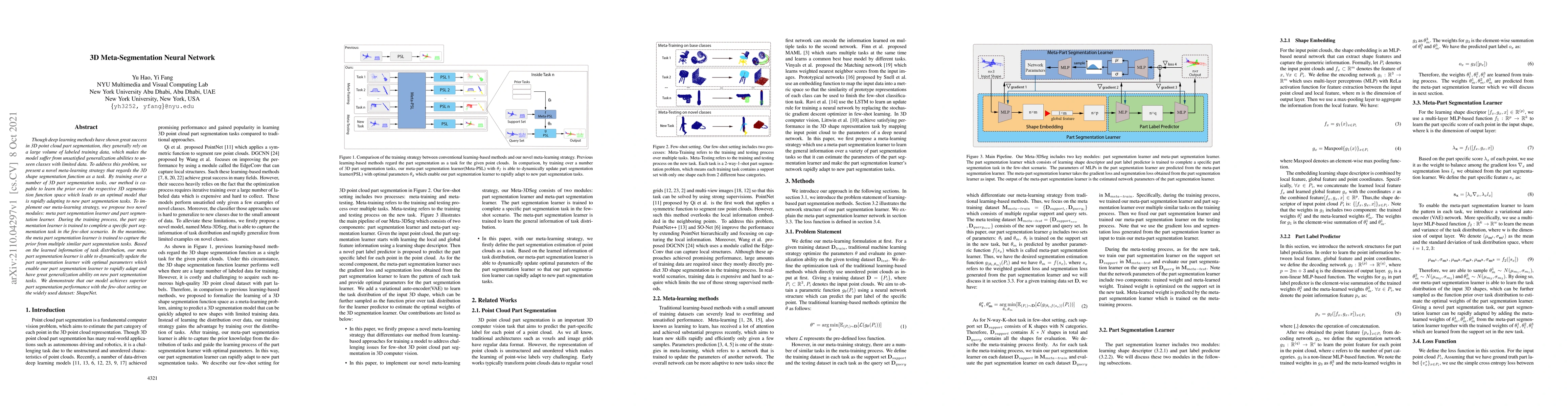 This paper introduces a meta-learning strategy for 3D point cloud part segmentation that enhances the model's ability to generalize to new tasks with limited data. The proposed method uses two modules to dynamically update a part segmentation learner based on prior knowledge from multiple segmentation tasks, achieving superior performance in few-shot settings.
