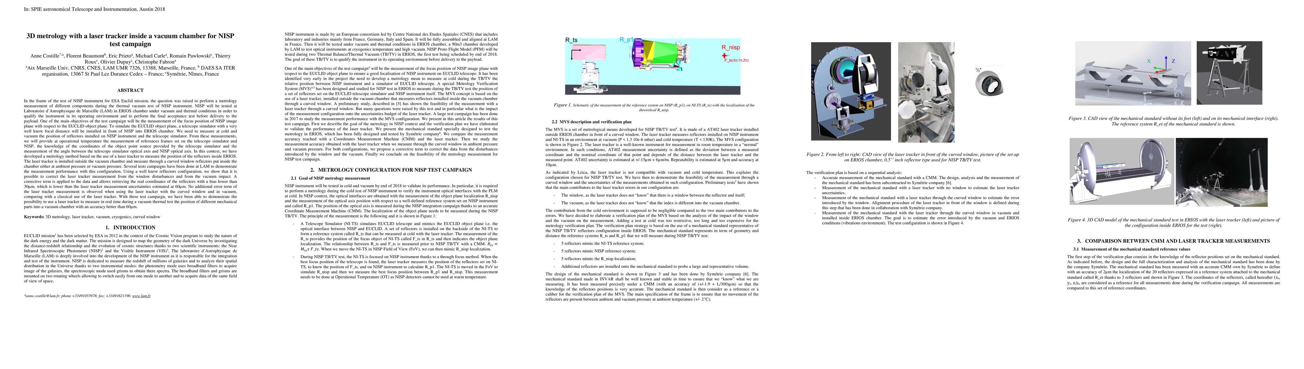 In the frame of the test of NISP instrument for ESA Euclid mission, the question was raised to perform a metrology measurement of different components during the thermal vacuum test of NISP instrument. NISP will be tested at Laboratoire d'Astrophysique de Marseille (LAM) in ERIOS chamber under vacuum and thermal conditions in order to qualify the instrument in its operating environment and to perform the final acceptance test before delivery to the payload. One of the main objectives of the test campaign will be the measurement of the focus position of NISP image plane with respect to the EUCLID object plane. To simulate the EUCLID object plane, a telescope simulator with a very well know focal distance will be installed in front of NISP into ERIOS chamber. We need to measure at cold and vacuum the position of reflectors installed on NISP instrument and the telescope simulator. From these measurements, we will provide at operational temperature the measurement of references frames set on the telescope simulator and NISP, the knowledge of the coordinates of the object point source provided by the telescope simulator and the measurement of the angle between the telescope simulator optical axis and NISP optical axis. In this context, we have developed a metrology method based on the use of a laser tracker to measure the position of the reflectors inside ERIOS. The laser tracker is installed outside the vacuum chamber and measure through a curved window reflectors put inside the chamber either at ambient pressure or vacuum pressure. Several tests campaigns have been done at LAM to demonstrate the measurement performance with this configuration. Using a well know reflectors configuration, we show that it is possible to correct the laser tracker measurement from the window disturbances and from the vacuum impact. A corrective term is applied to the data and allows retrieving the real coordinates of the reflectors with a bias lower than 30$\mu$m, which is lower than the laser tracker measurement uncertainties estimated at 60$\mu$m. No additional error term of the laser tracker measurement is observed when using the laser tracker with the curved window and in vacuum, comparing with a classical use of the laser tracker. With these test campaign, we have been able to demonstrate the possibility to use a laser tracker to measure in real time during a vacuum thermal test the position of different mechanical parts into a vacuum chamber with an accuracy better than 60$\mu$m.