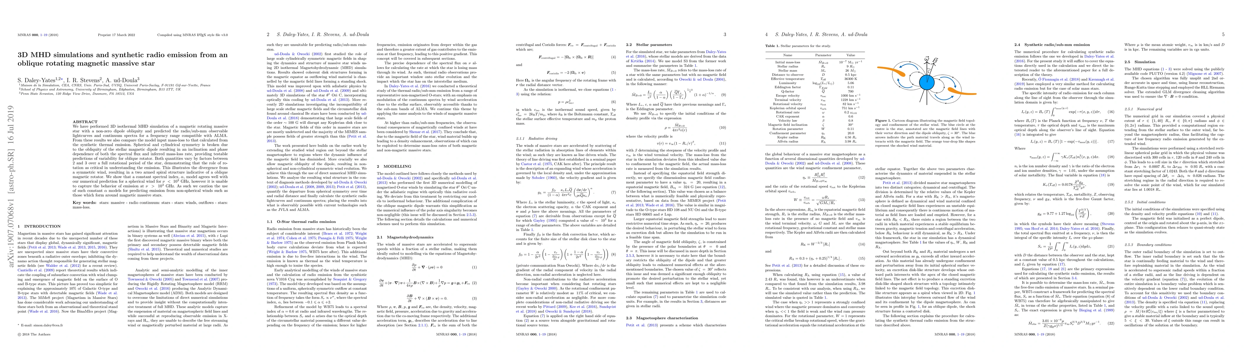 Researchers simulated radio emission from a massive star with an oblique magnetic field, predicting variability in lightcurves and spectra that depend on the star's rotation and magnetic inclination.