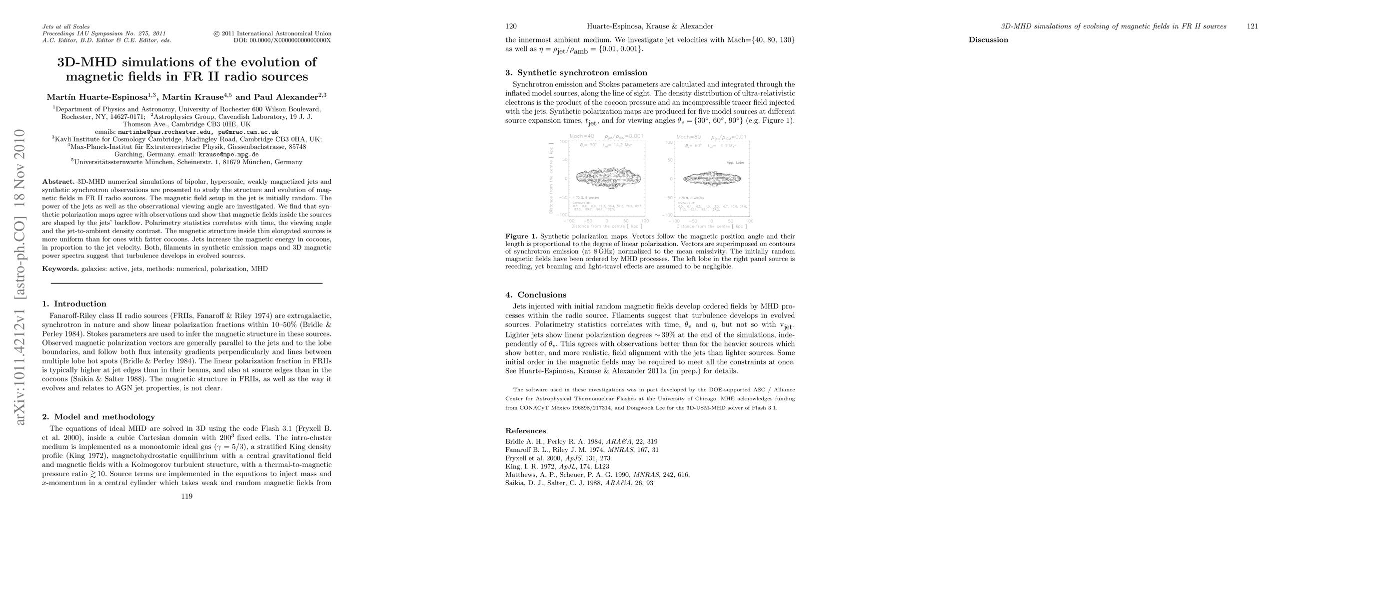 This paper uses 3D-MHD simulations to study the magnetic field evolution in FR II radio sources, finding that the jets' backflow shapes the magnetic fields and that synthetic polarization maps correlate with observations. The study reveals that magnetic structures are more uniform in thin sources and turbulence develops in evolved sources.