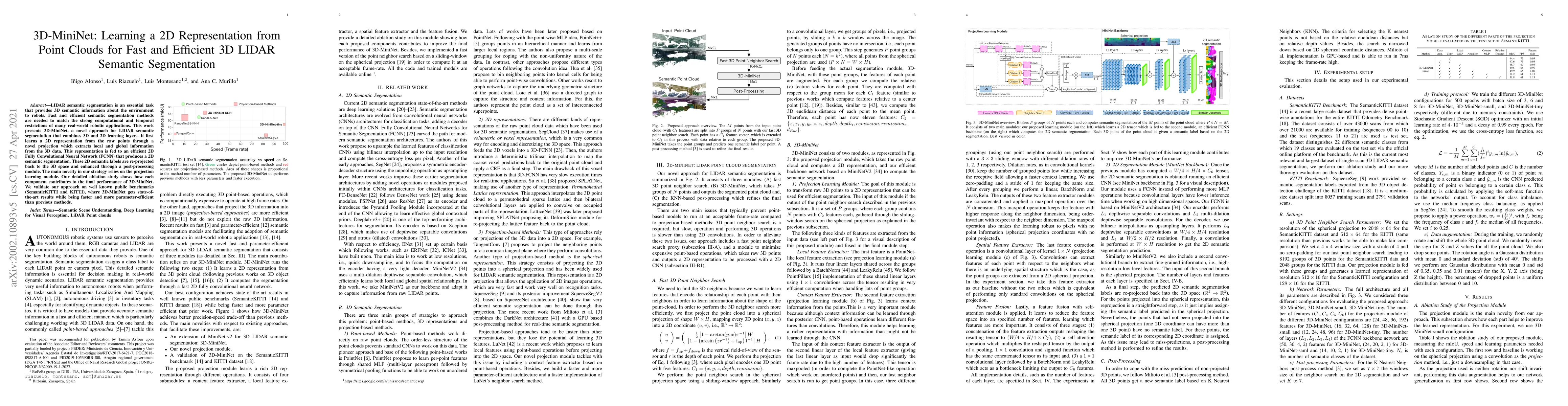 3D-MiniNet introduces a novel method for fast and efficient 3D LIDAR semantic segmentation by combining 3D and 2D learning layers, achieving state-of-the-art results on public benchmarks while being faster and more parameter-efficient than previous methods. The approach leverages a projection learning module to extract 2D representations from point clouds, which are processed by a 2D Fully Convolutional Neural Network for semantic segmentation.