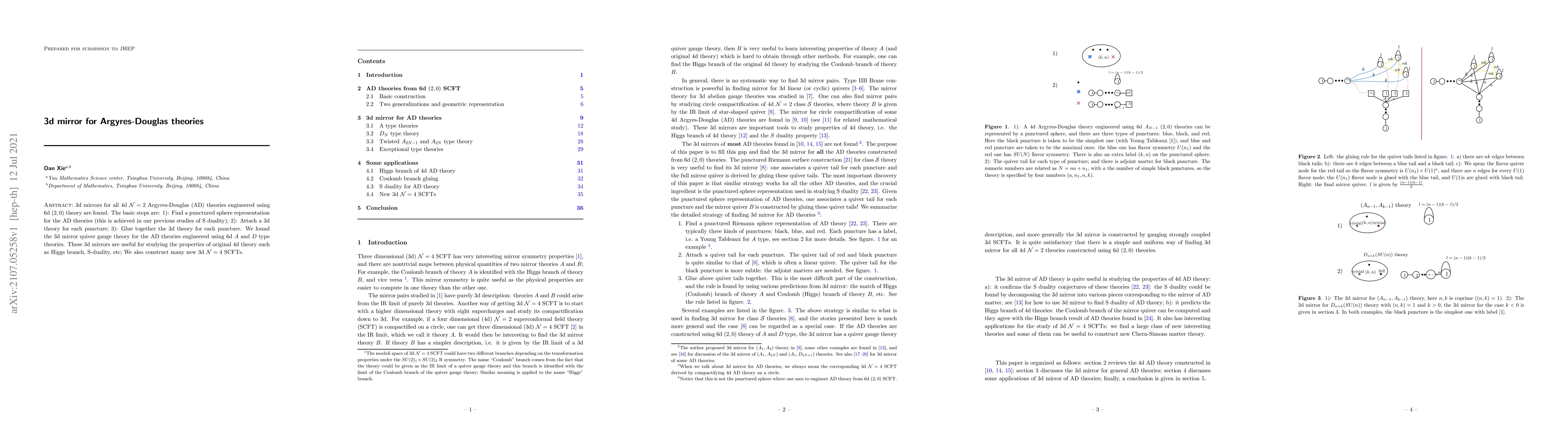 The paper finds 3d mirror quiver gauge theories for 4d $\mathcal{N}=2$ Argyres-Douglas theories using 6d $(2,0)$ theories, aiding in studying properties like Higgs branch and S-duality, and constructs new 3d $\mathcal{N}=4$ SCFTs.
