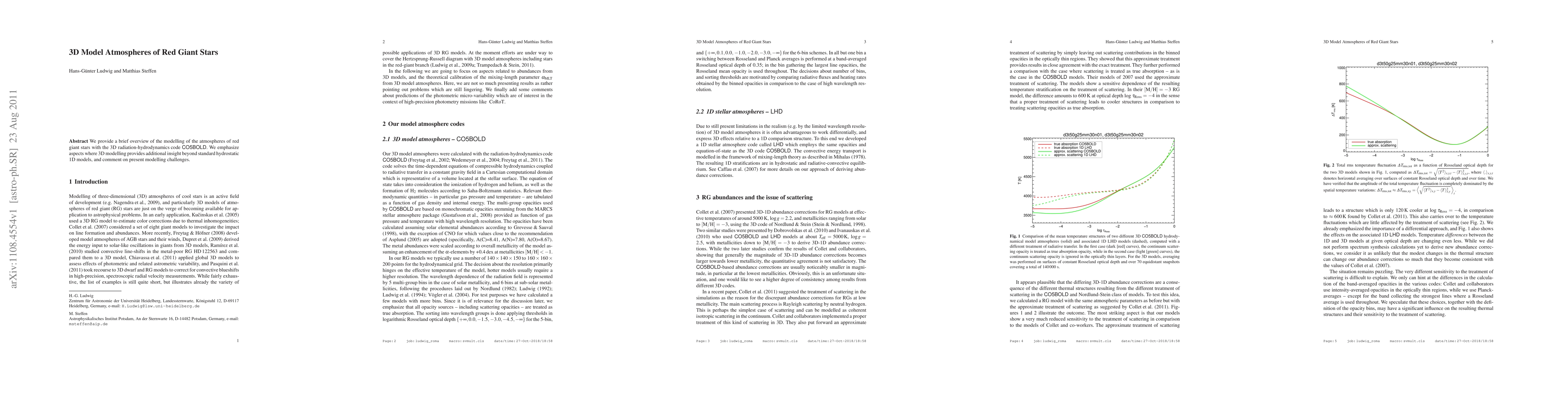 This paper presents 3D radiation-hydrodynamics modelling of red giant star atmospheres using the CO5BOLD code, highlighting how 3D models offer deeper insights compared to traditional 1D hydrostatic models and discusses current modelling challenges.