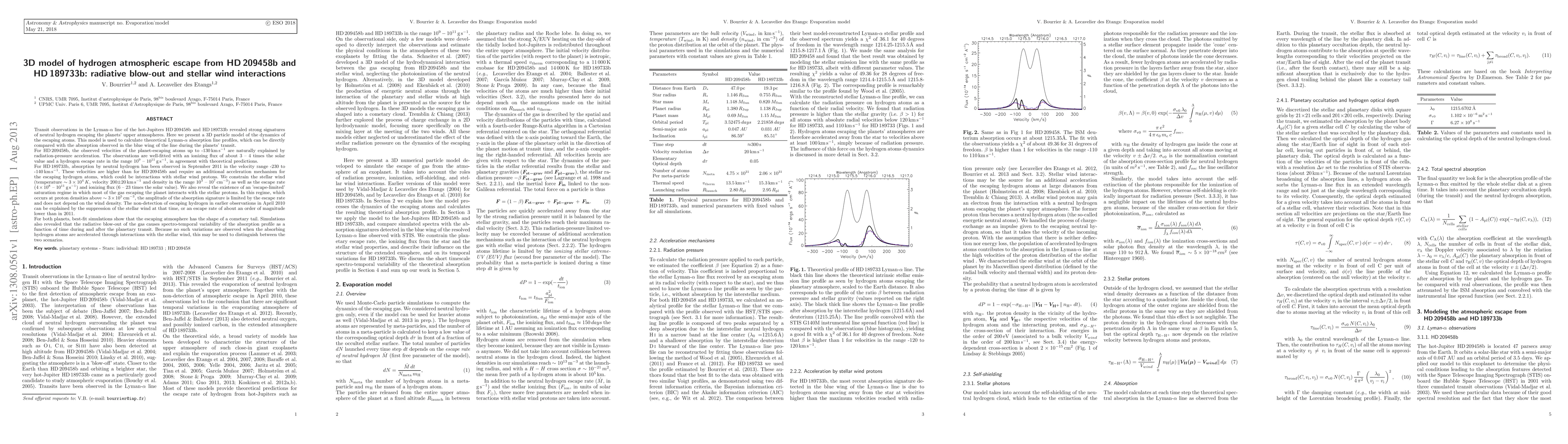 This paper presents a 3D particle model to simulate the dynamics of hydrogen escaping from the atmospheres of HD209458b and HD189733b, explaining the observed Ly-alpha absorption profiles. For HD209458b, radiation-pressure acceleration explains the escape velocities, while for HD189733b, stellar wind interactions provide additional acceleration, revealing an escape-limited saturation regime.