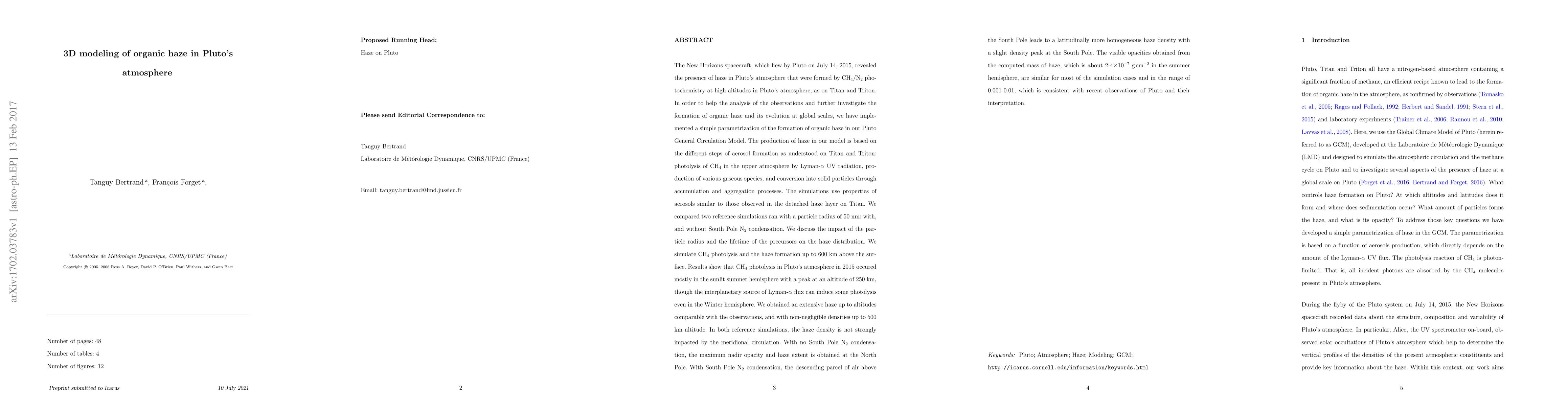 This paper models the formation and distribution of organic haze in Pluto's atmosphere using a Pluto General Circulation Model, showing that haze formation peaks in the summer hemisphere and extends up to 500 km altitude. The study highlights the influence of particle radius and precursor lifetime on haze distribution, with varying effects depending on N2 condensation at the South Pole.
