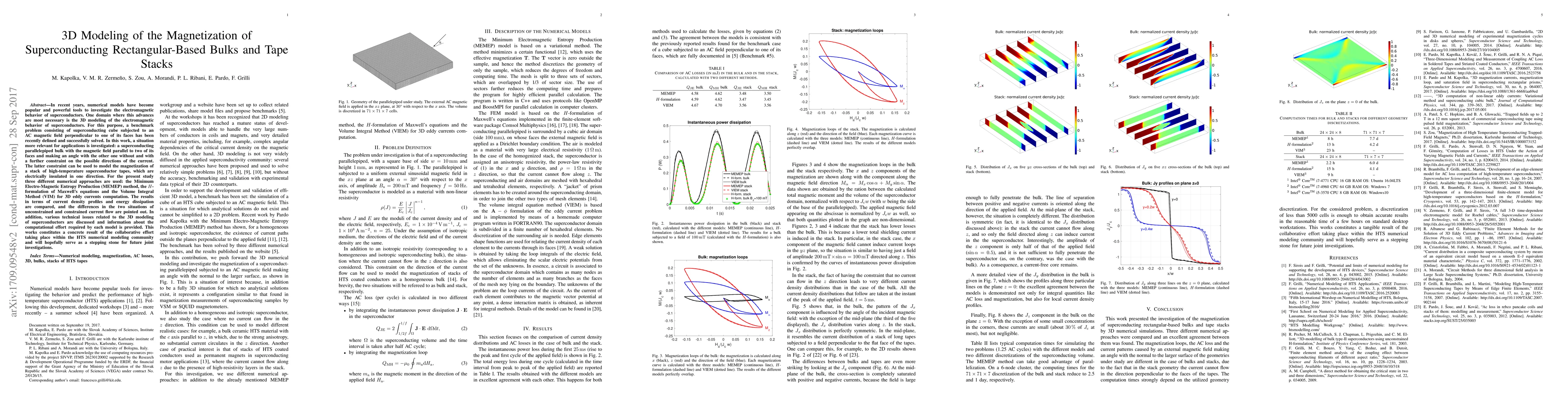 In recent years, numerical models have become popular and powerful tools to investigate the electromagnetic behavior of superconductors. One domain where this advances are most necessary is the 3D modeling of the electromagnetic behavior of superconductors. For this purpose, a benchmark problem consisting of superconducting cube subjected to an AC magnetic field perpendicular to one of its faces has been recently defined and successfully solved. In this work, a situation more relevant for applications is investigated: a superconducting parallelepiped bulk with the magnetic field parallel to two of its faces and making an angle with the other one without and with a further constraint on the possible directions of the current. The latter constraint can be used to model the magnetization of a stack of high-temperature superconductor tapes, which are electrically insulated in one direction. For the present study three different numerical approaches are used: the Minimum Electro-Magnetic Entropy Production (MEMEP) method, the $H$-formulation of Maxwell's equations and the Volume Integral Method (VIM) for 3D eddy currents computation. The results in terms of current density profiles and energy dissipation are compared, and the differences in the two situations of unconstrained and constrained current flow are pointed out. In addition, various technical issues related to the 3D modeling of superconductors are discussed and information about the computational effort required by each model is provided. This works constitutes a concrete result of the collaborative effort taking place within the HTS numerical modeling community and will hopefully serve as a stepping stone for future joint investigations.