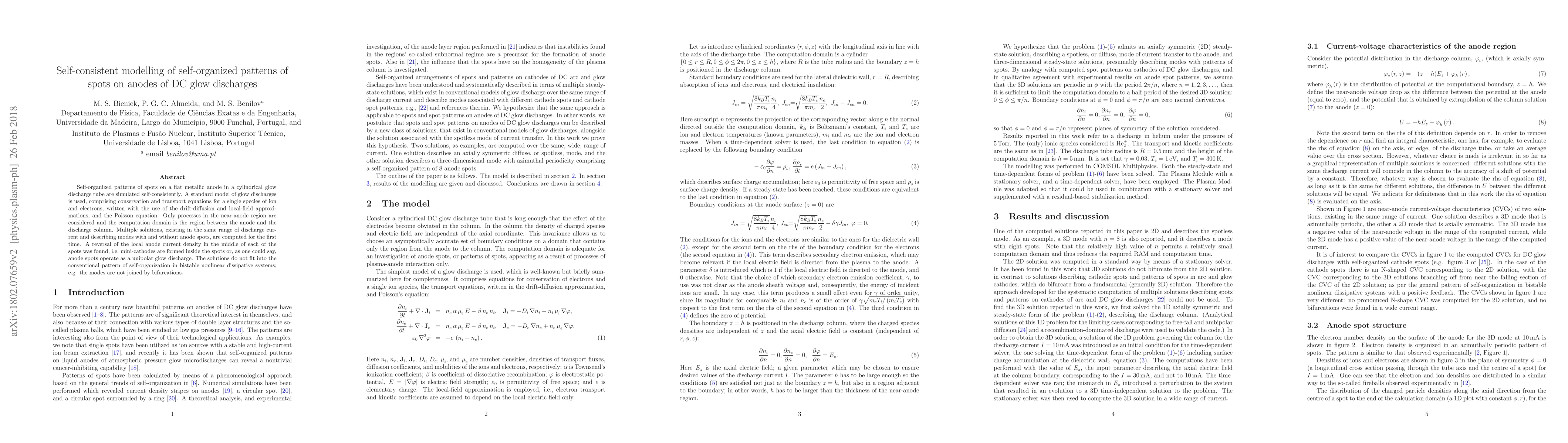 This paper simulates self-organized spot patterns on a metallic anode in a DC glow discharge using a standard model, revealing unexpected reversals in local anode current density forming mini-cathodes within spots. The results challenge conventional understanding of self-organization in bistable systems.
