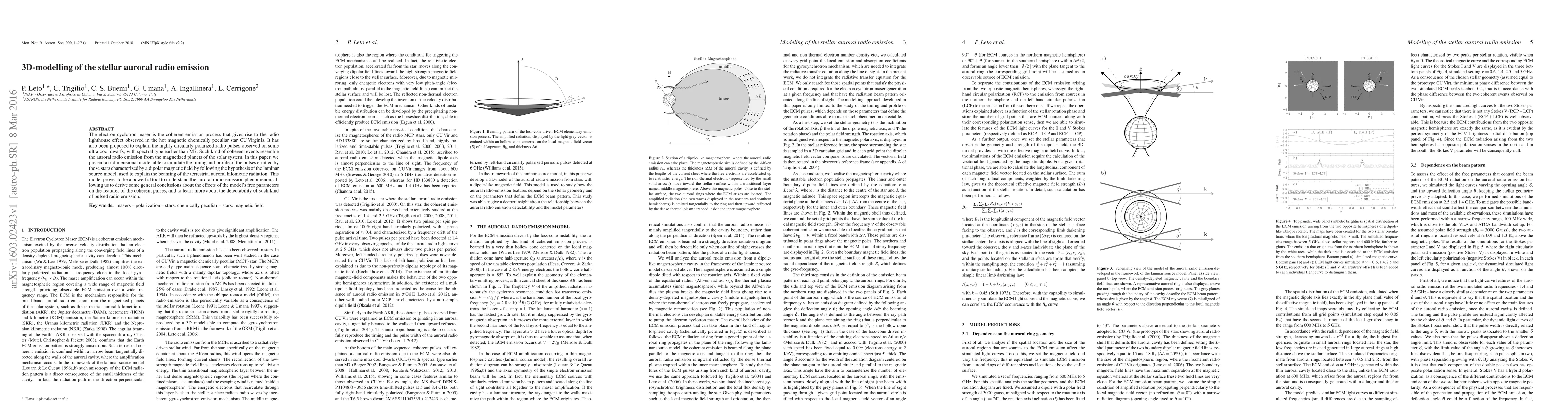 The electron cyclotron maser is the coherent emission process that gives rise to the radio lighthouse effect observed in the hot magnetic chemically peculiar star CU Virginis. It has also been proposed to explain the highly circularly polarized radio pulses observed on some ultra cool dwarfs, with spectral type earlier than M7. Such kind of coherent events resemble the auroral radio emission from the magnetized planets of the solar system. In this paper, we present a tridimensional model able to simulate the timing and profile of the pulses emitted by those stars characterized by a dipolar magnetic field by following the hypothesis of the laminar source model, used to explain the beaming of the terrestrial auroral kilometric radiation. This model proves to be a powerful tool to understand the auroral radio-emission phenomenon, allowing us to derive some general conclusions about the effects of the model's free parameters on the features of the coherent pulses, and to learn more about the detectability of such kind of pulsed radio emission.