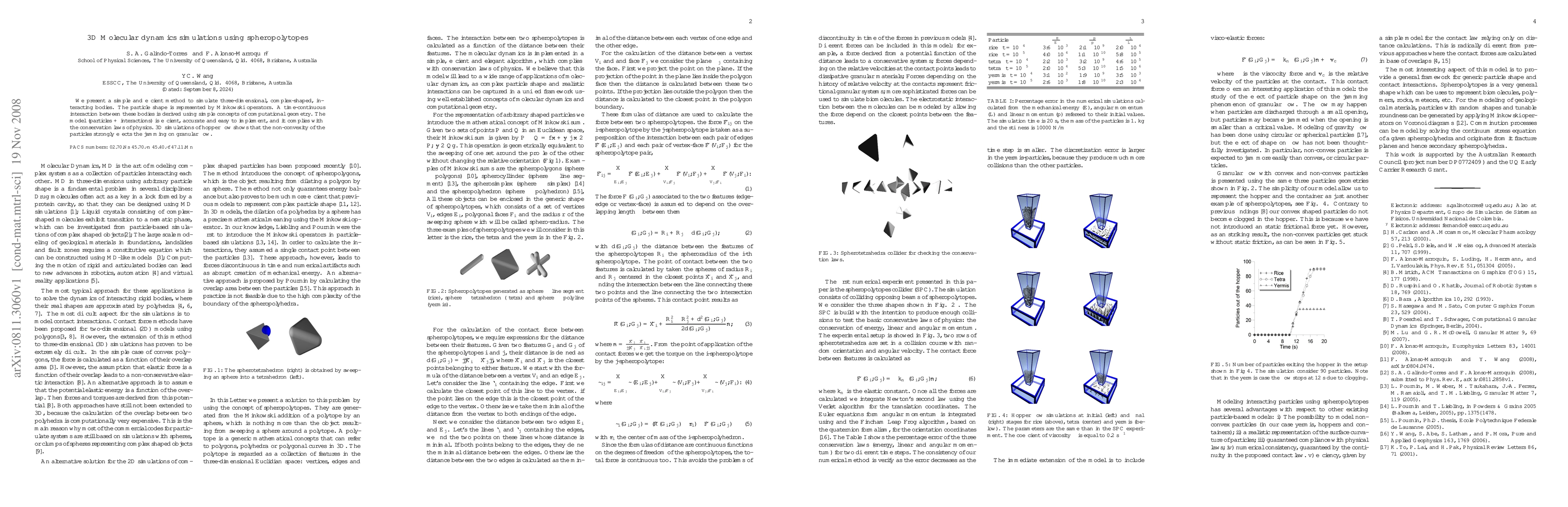 We present a simple and efficient method to simulate three-dimensional, complex-shaped, interacting bodies. The particle shape is represented by Minkowski operators. A time-continuous interaction between these bodies is derived using simple concepts of computational geometry. The model (particles + interactions) is efficient, accurate and easy to implement, and it complies with the conservation laws of physics. 3D simulations of hopper flow shows that the non-convexity of the particles strongly effects the jamming on granular flow.