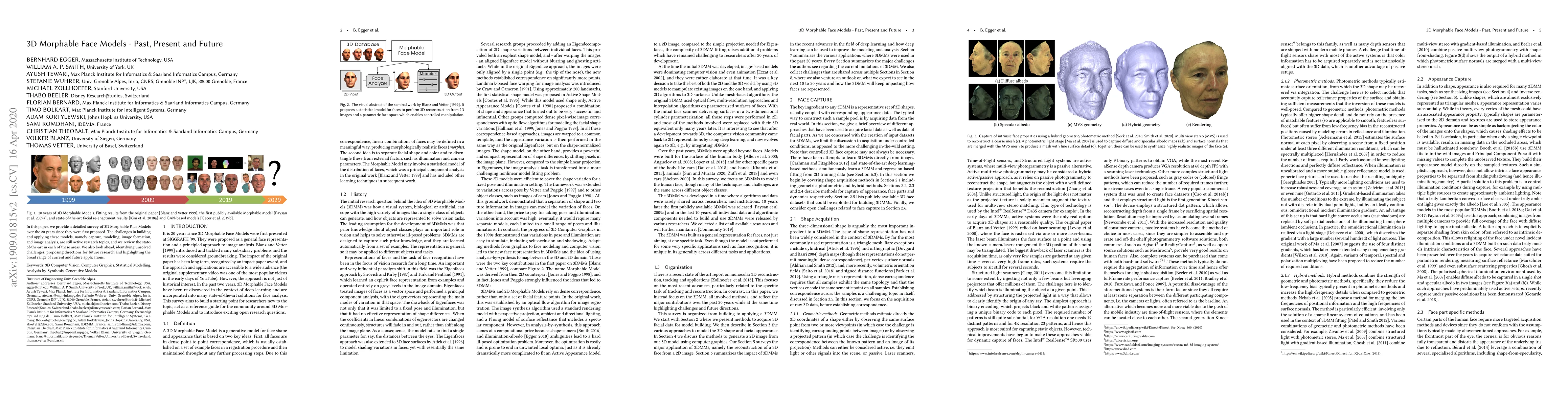 This paper surveys the evolution of 3D Morphable Face Models over the past two decades, reviewing current state-of-the-art techniques and challenges in capture, modeling, image formation, and analysis. It also outlines future research directions and potential applications.