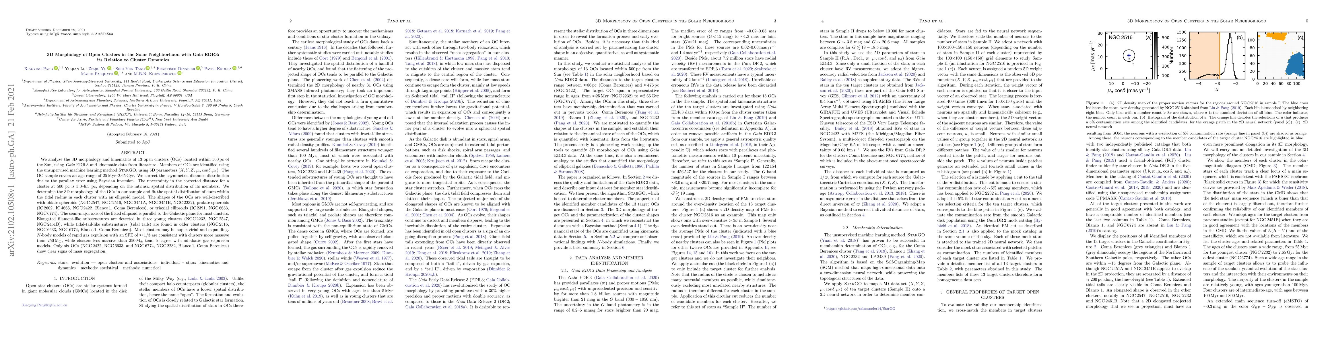 Researchers analyzed 13 open clusters near the Sun, finding their 3D shapes and kinematics, with most being oblate spheroids or prolate spheroids, and some showing signs of mass segregation.