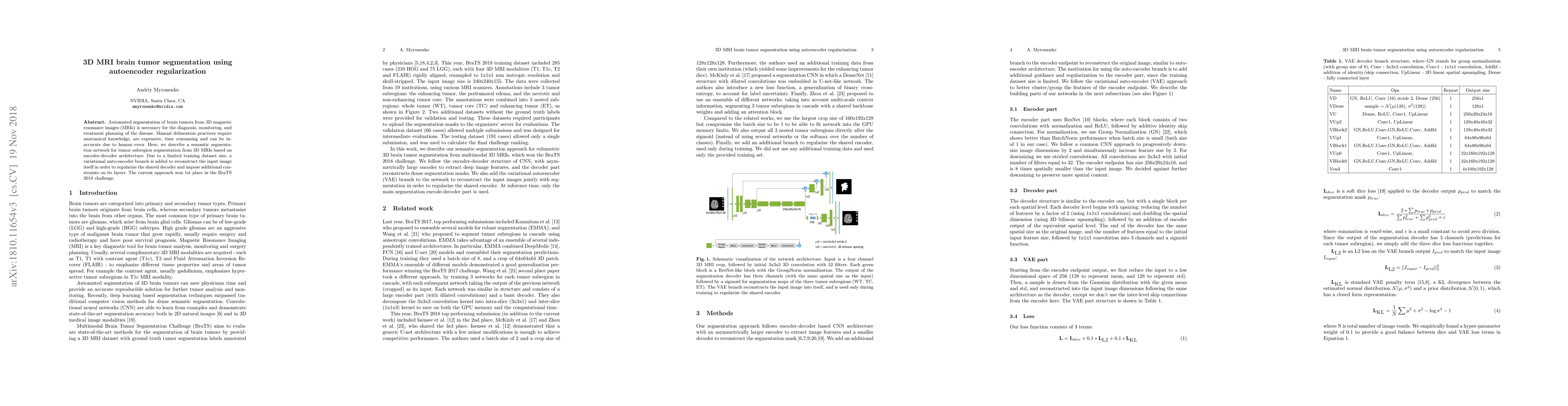 This paper presents a semantic segmentation network using an encoder-decoder architecture with autoencoder regularization for segmenting brain tumors in 3D MRIs. To address limited training data, a variational autoencoder reconstructs the input image, enhancing the model's performance, which won first place in the BraTS 2018 challenge.