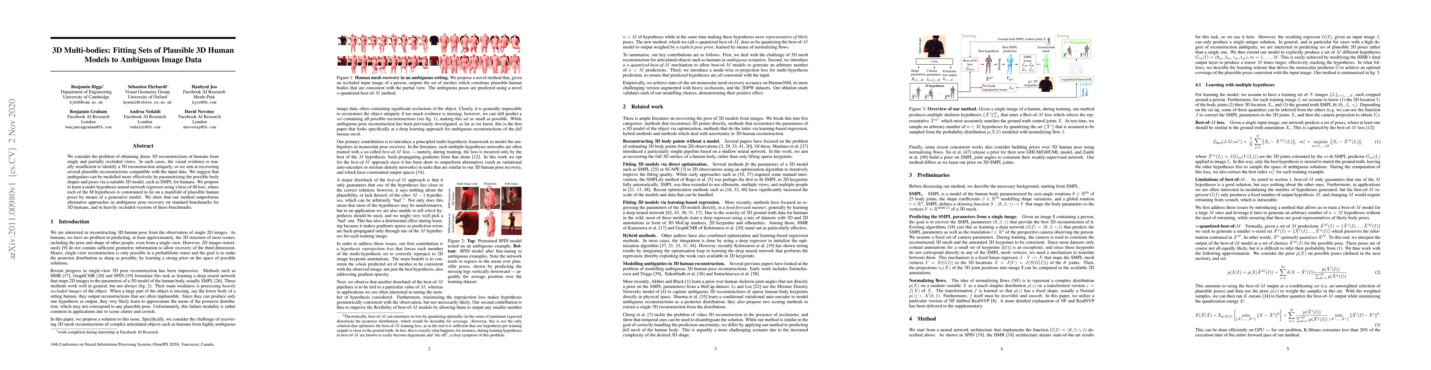 We consider the problem of obtaining dense 3D reconstructions of humans from single and partially occluded views. In such cases, the visual evidence is usually insufficient to identify a 3D reconstruction uniquely, so we aim at recovering several plausible reconstructions compatible with the input data. We suggest that ambiguities can be modelled more effectively by parametrizing the possible body shapes and poses via a suitable 3D model, such as SMPL for humans. We propose to learn a multi-hypothesis neural network regressor using a best-of-M loss, where each of the M hypotheses is constrained to lie on a manifold of plausible human poses by means of a generative model. We show that our method outperforms alternative approaches in ambiguous pose recovery on standard benchmarks for 3D humans, and in heavily occluded versions of these benchmarks.