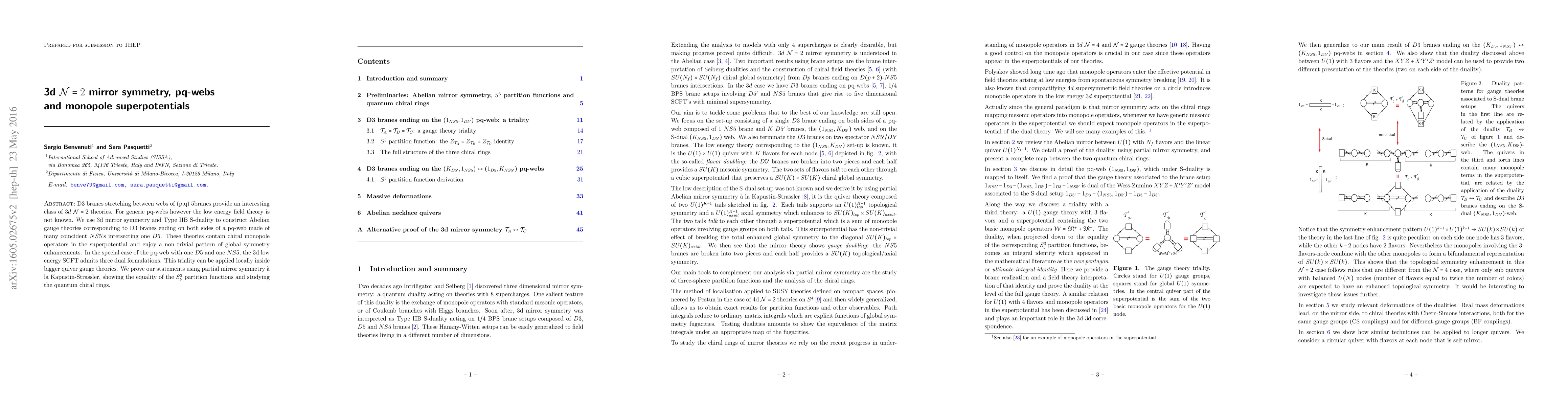 D3 branes stretching between webs of (p,q) 5branes provide an interesting class of 3d N=2 theories. For generic pq-webs however the low energy field theory is not known. We use 3d mirror symmetry and Type IIB S-duality to construct Abelian gauge theories corresponding to D3 branes ending on both sides of a pq-web made of many coincident NS5's intersecting one D5. These theories contain chiral monopole operators in the superpotential and enjoy a non trivial pattern of global symmetry enhancements. In the special case of the pq-web with one D5 and one NS5, the 3d low energy SCFT admits three dual formulations. This triality can be applied locally inside bigger quiver gauge theories. We prove our statements using partial mirror symmetry `a la Kapustin-Strassler, showing the equality of the S^3_b partition functions and studying the quantum chiral rings.