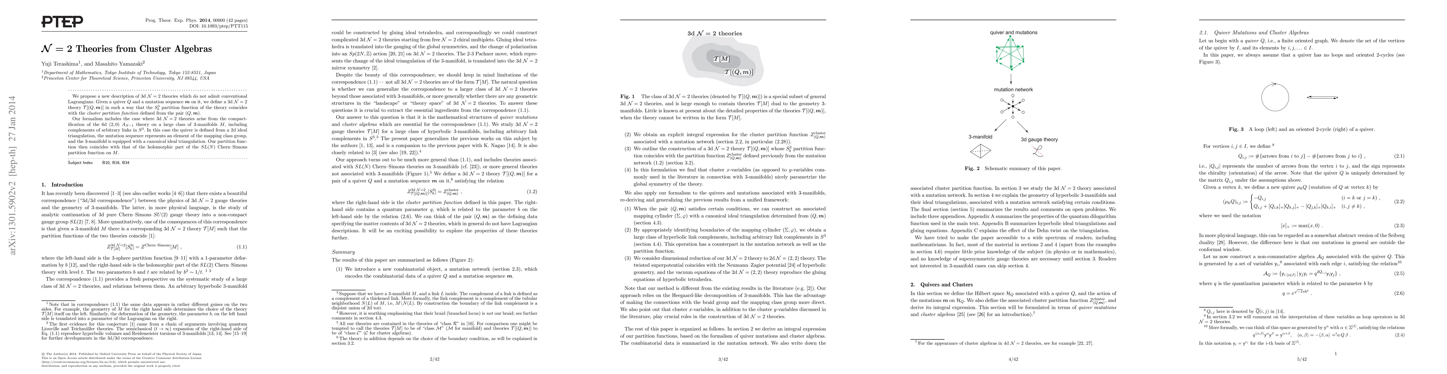 This paper proposes a novel description of 3d $\mathcal{N}=2$ theories using cluster algebras, defining a theory $\mathcal{T}[(Q,m)]$ from a quiver and a mutation sequence, whose partition function matches the cluster partition function. It also connects these theories to the compactification of 6d $(2,0)$ $A_{N-1}$ theory on various 3-manifolds.